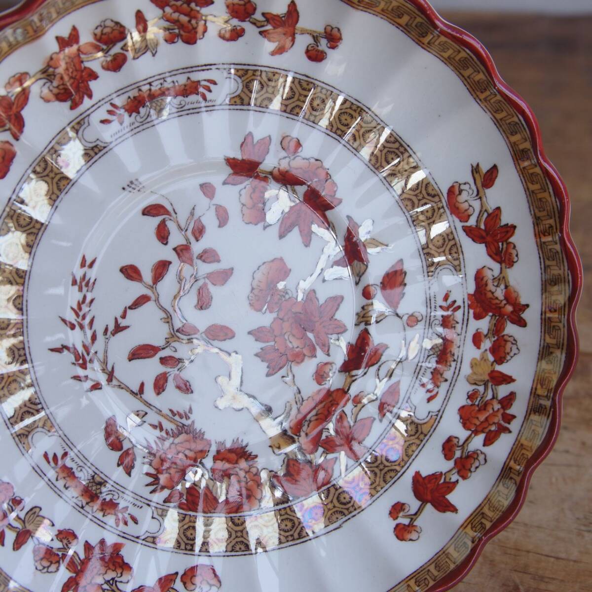 写真ではわかりにくいのですが、持ち手やリムなど、絵柄の一部に、オパールのような光沢のあるオレンジ色が塗られています。