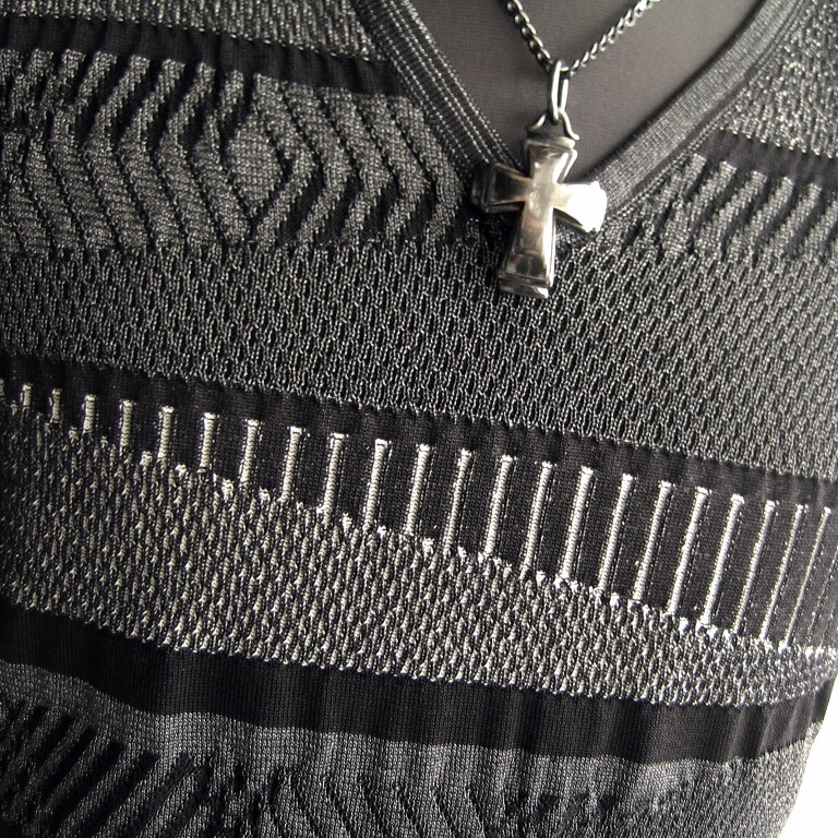 ■ランダムリブ、幾何学、メッシュ、天竺を斜めに組み合わせ、色をボーダー状で分けている複雑な柄をリンクス編みで表現しています