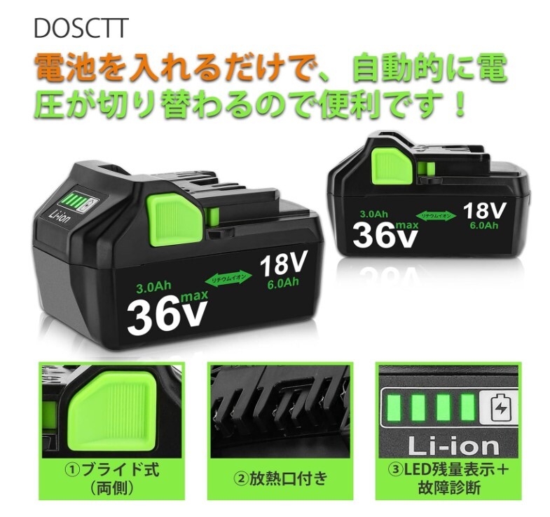 限定特価!D172 DOSCTT 高品質バッテリー 36V-18V ハイコーキ互換 36v/3000mAh 18v/6000mAh 自動切替 リチウムイオン【2個セット】[緑]