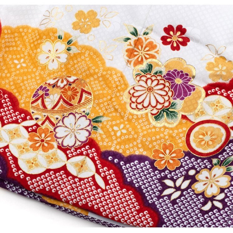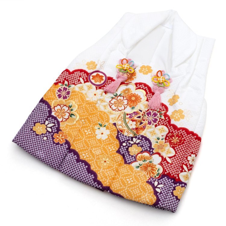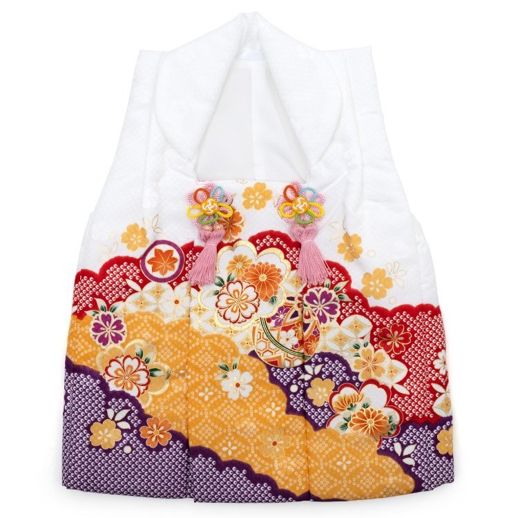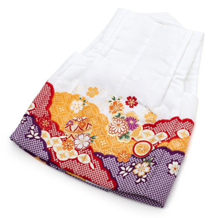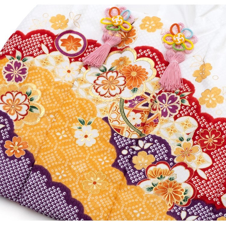 商品説明 | 白の地色の被布コートです。 かわいい毬や、桜などの花柄が描かれていて、とてもかわいい七五三・被布コートです。 |