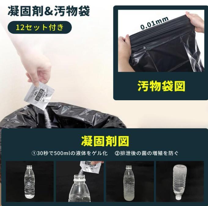 【「消臭凝固剤」「抗菌性」「吸水力」】凝固剤はただ固めるだけではありません!排泄後の菌の増殖を防ぐ「抗菌性」のある凝固剤を採用!抗菌性試験も実施しており、非常時でも安心の抗菌性です!「抗菌性」に加えて「消臭性」も追求しています!凝固剤を使用した場合、アンモニアに対する消臭性を発揮します!凝固剤は500mlの水分をしっかりと固めてトイレのあとに廃棄しやすくなります。