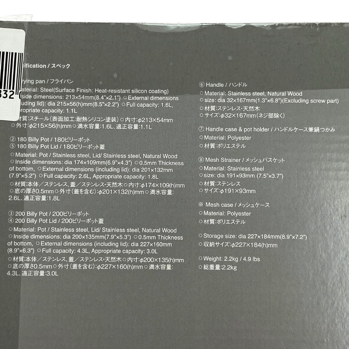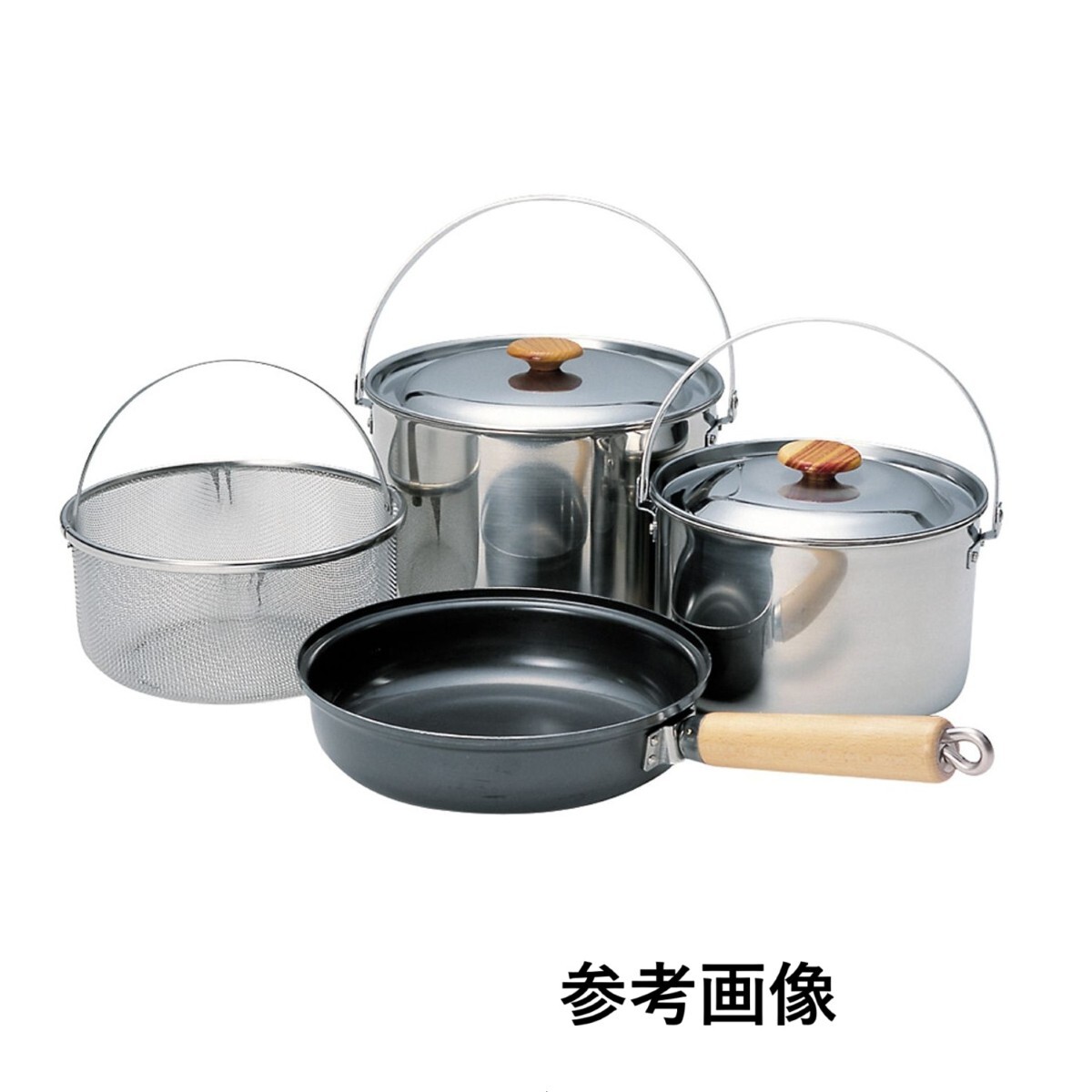 フライパン、180ビリーポット、200ビリーポット、メッシュバスケットの4点セットです。