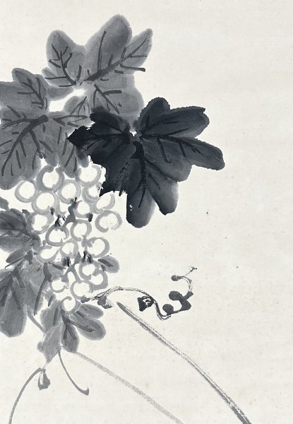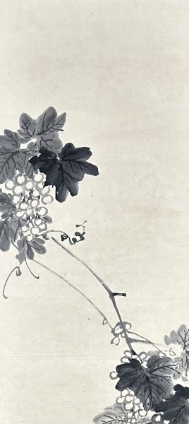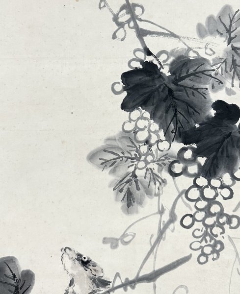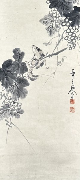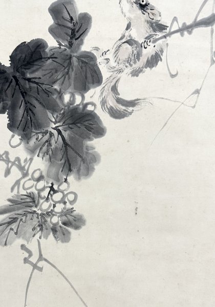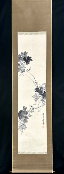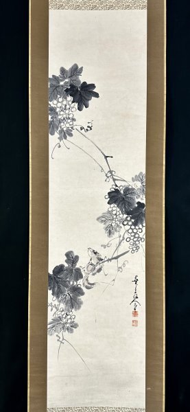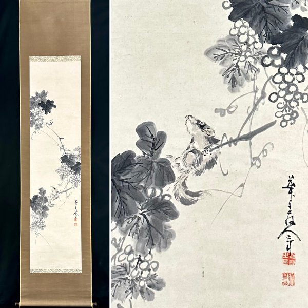 c10009z【真作】佐川華谷「葡萄栗鼠図」掛軸 紙本 肉筆 花鳥図 鳥獣 渡辺小華 野沢白華の門人 茨城の人 ぶどう リス