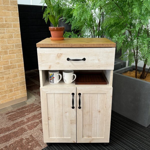 | ●オシャレな古木調デザイン● ・フェイクグリーンとの相性抜群!オフィスをオシャレに演出できます。 ●棚板を調節して備品をすっきり庫内に収納!● ・お盆やティーカップなどの備品を収納可能。レンジ台としても活用できます。 ●汚れに強いメラミン天板● ・傷・水・汚れに強いメラミン化粧板を使用。天板の上で飲み物を準備する際も衛生的です。 明るい古木調の木目が優しい雰囲気を漂わせる木製キッチンワゴン。豊富な収納力と、ナチュラルなカントリー風のデザインが特徴です。カトラリーをしまうのに便利な引出しや、お盆収納用としての中間スペースを備えています。掃除やレイアウト変更の際でもラクに移動が可能なキャスター付で前面の2脚にはストッパーを搭載しており、固定時に役立ちます。オフィスだけでなくご家庭でのご使用にも適しています。 | |