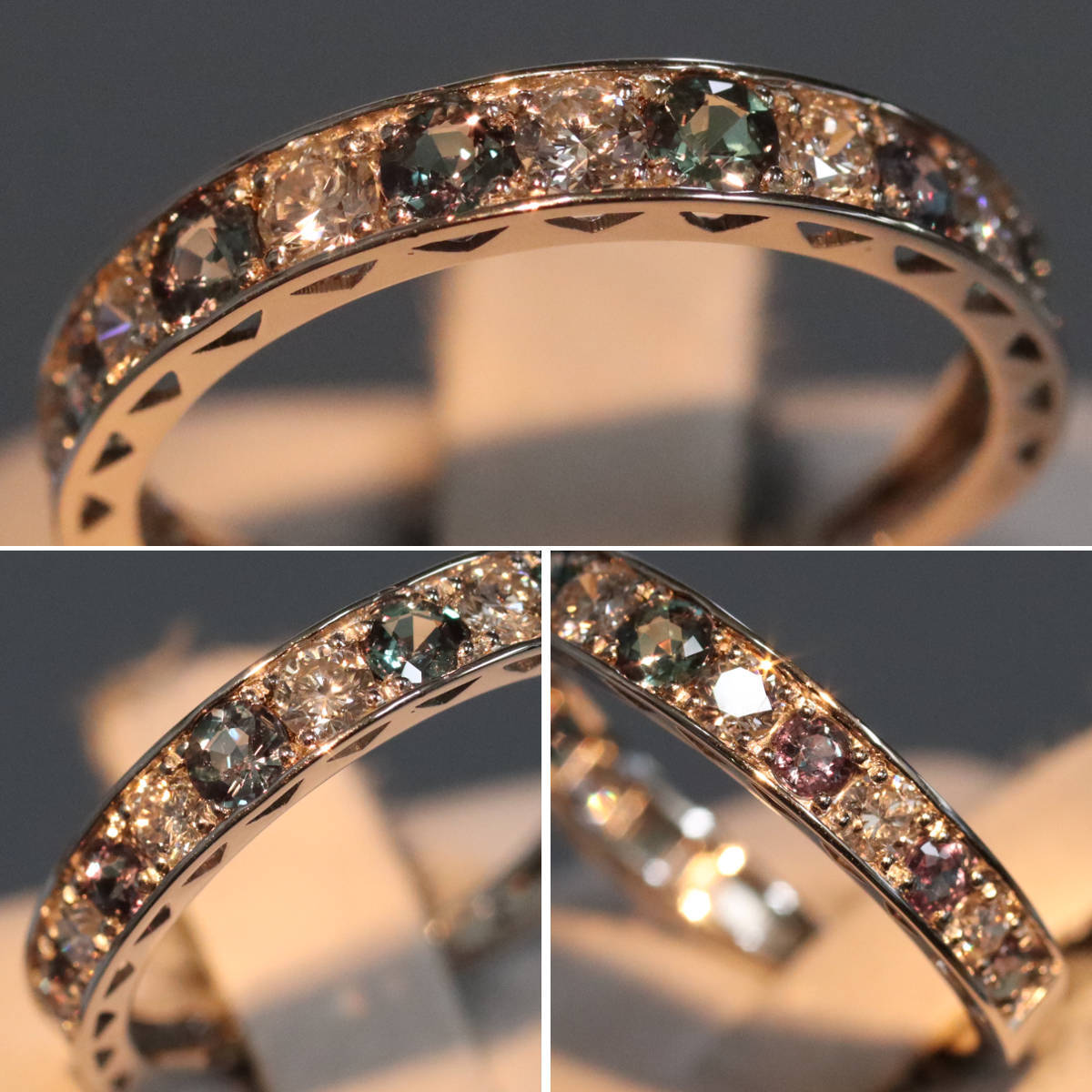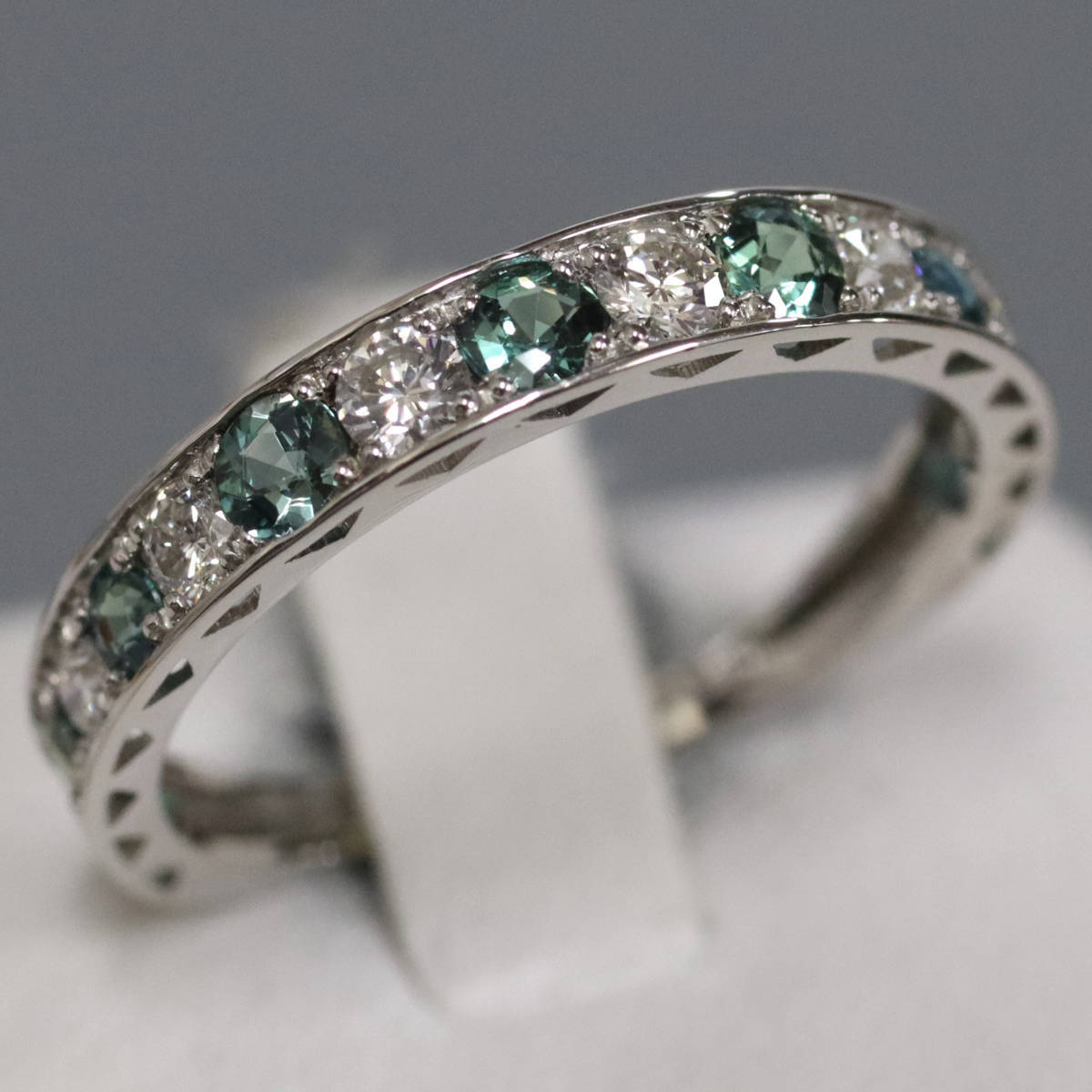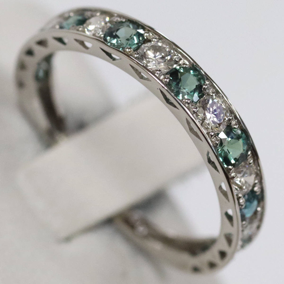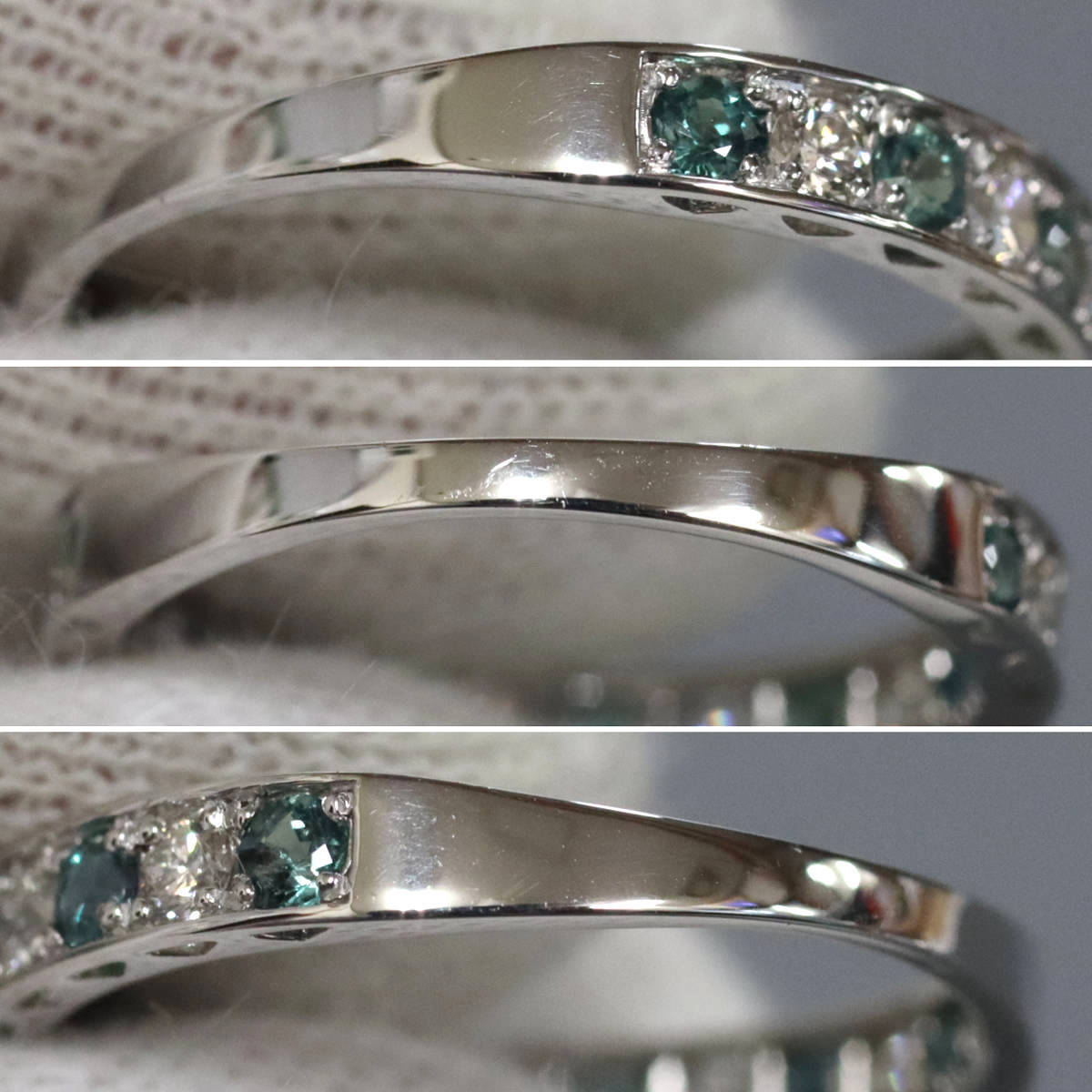 Pt900アレキサンドライトダイヤモンドリングの中古品です。 鑑別書が付属します。 アレキサンドライトは、蛍光灯下では青みがかった緑色で、白熱灯下では紫色です。 写真5枚目のように、変色効果は部分的で、色の変化が少ないものもあります。 アレキサンドライトはわずかにインクルージョンがありますが、ダイヤモンドはインクルージョンが少ないです。 地金にはわずかに小傷があります。