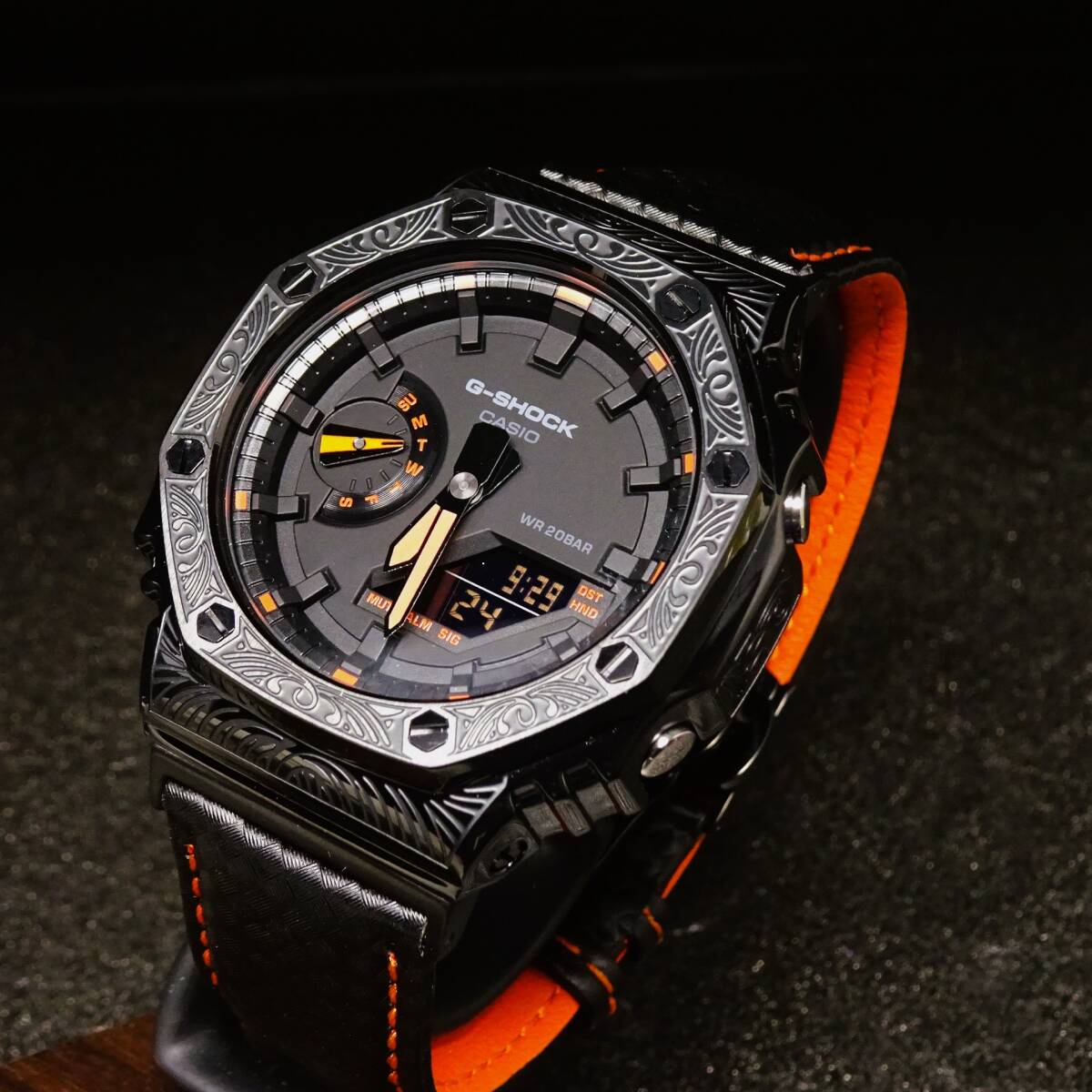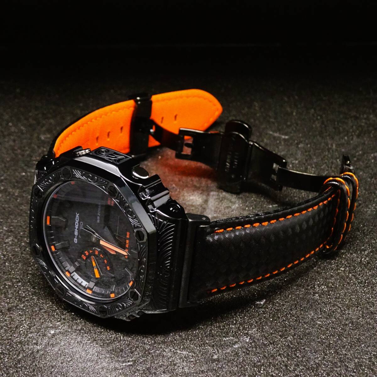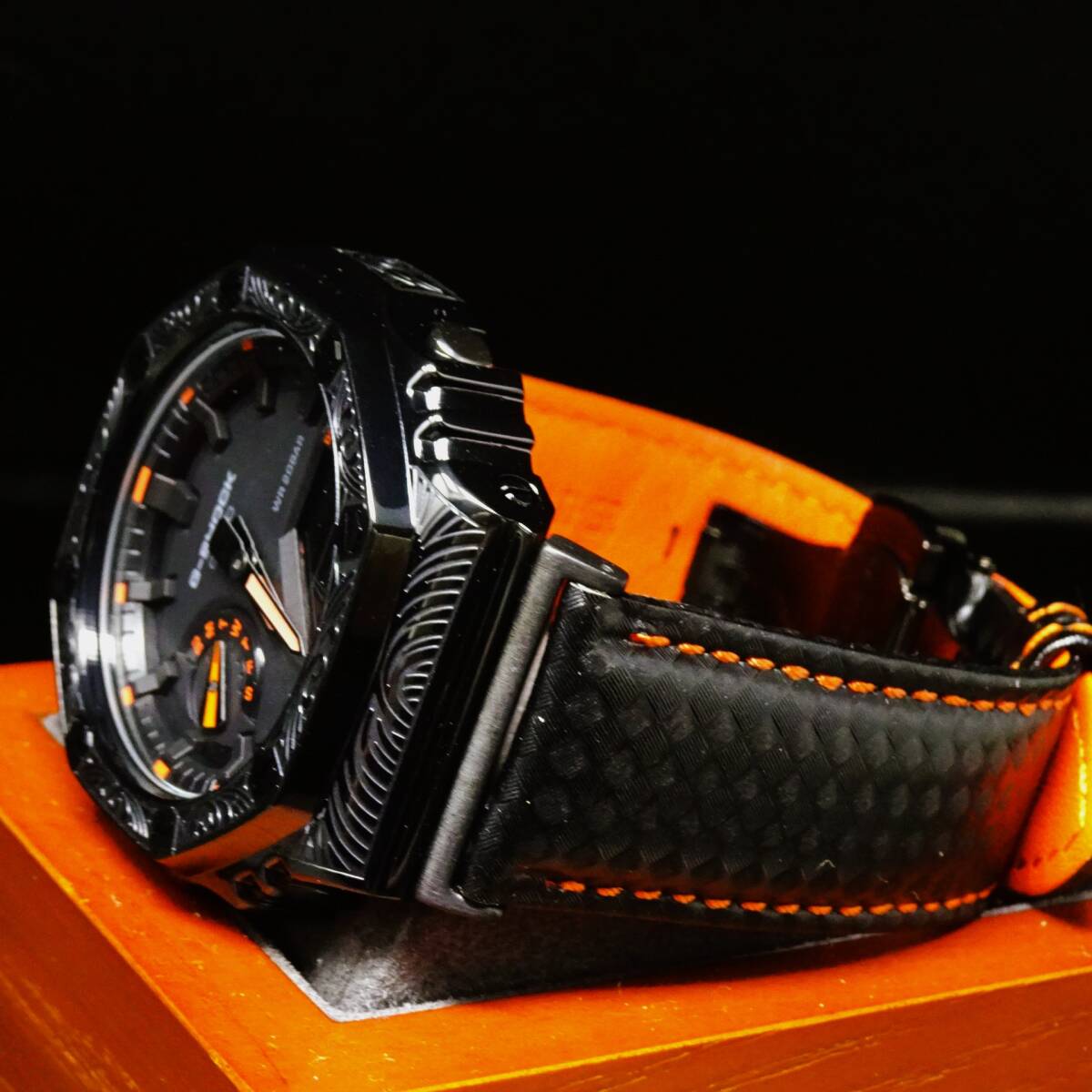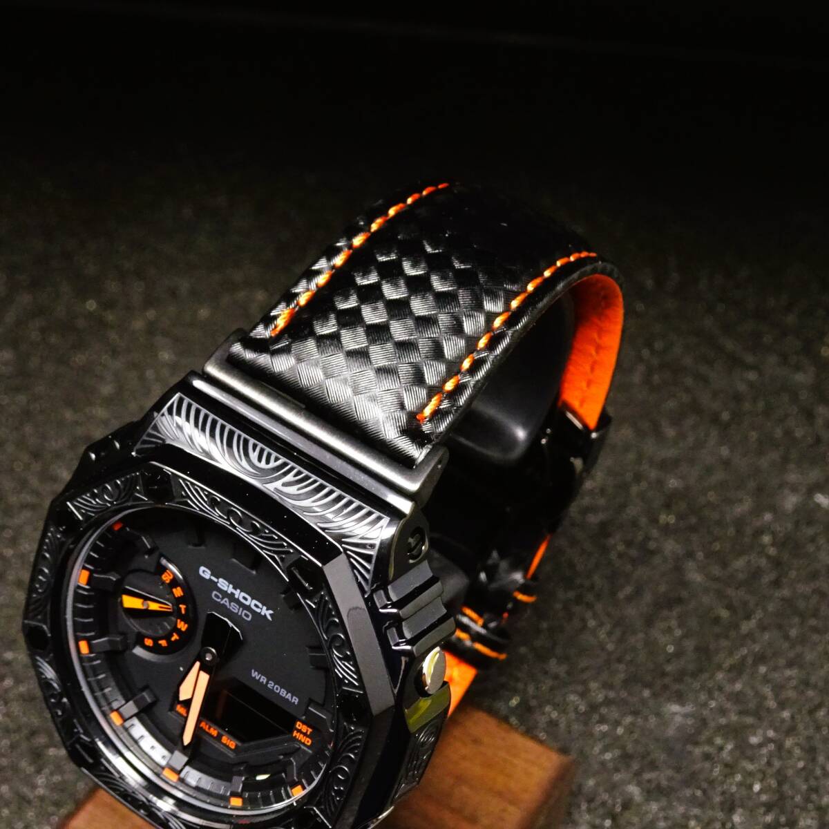 〓新品〓GショックCUSTOM・MADE腕時計〓正規GA2100本体付ステンレス製ベネチアン柄エンボス加工ベゼル〓カーボン柄本革ベルト〓カシオーク
