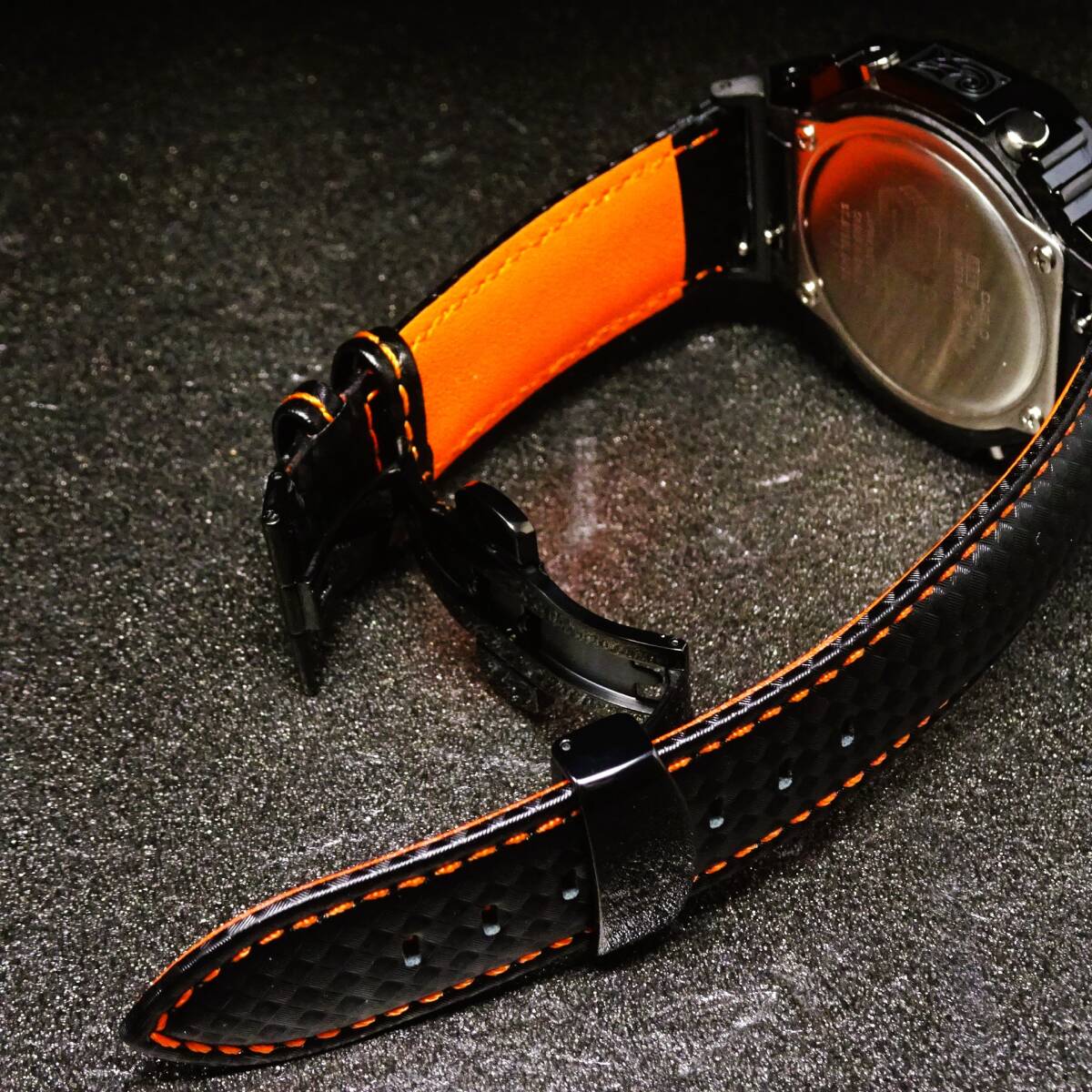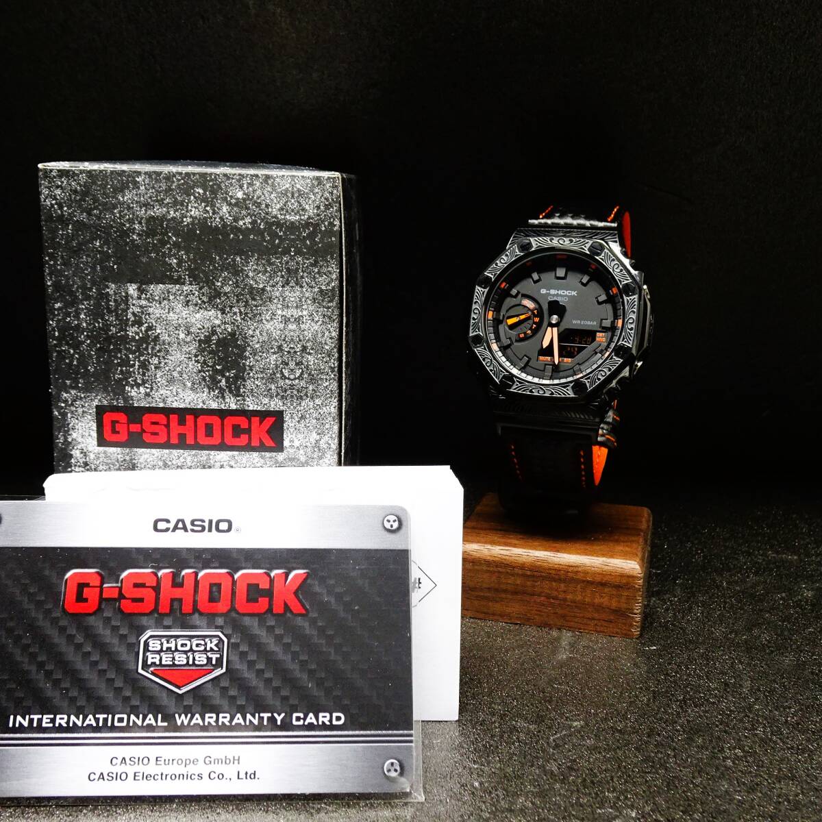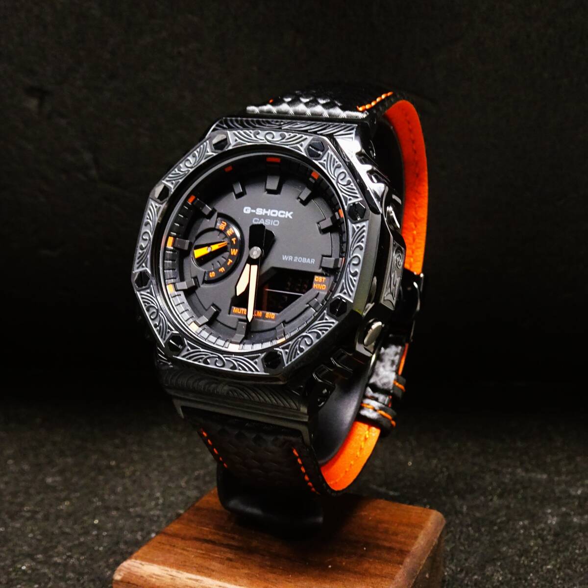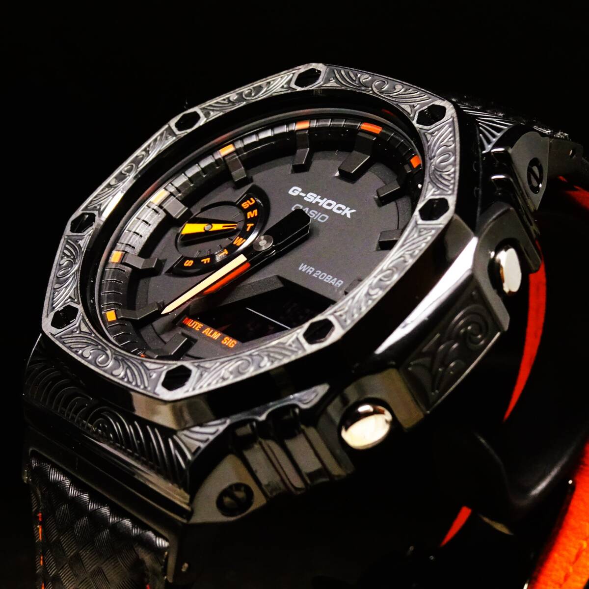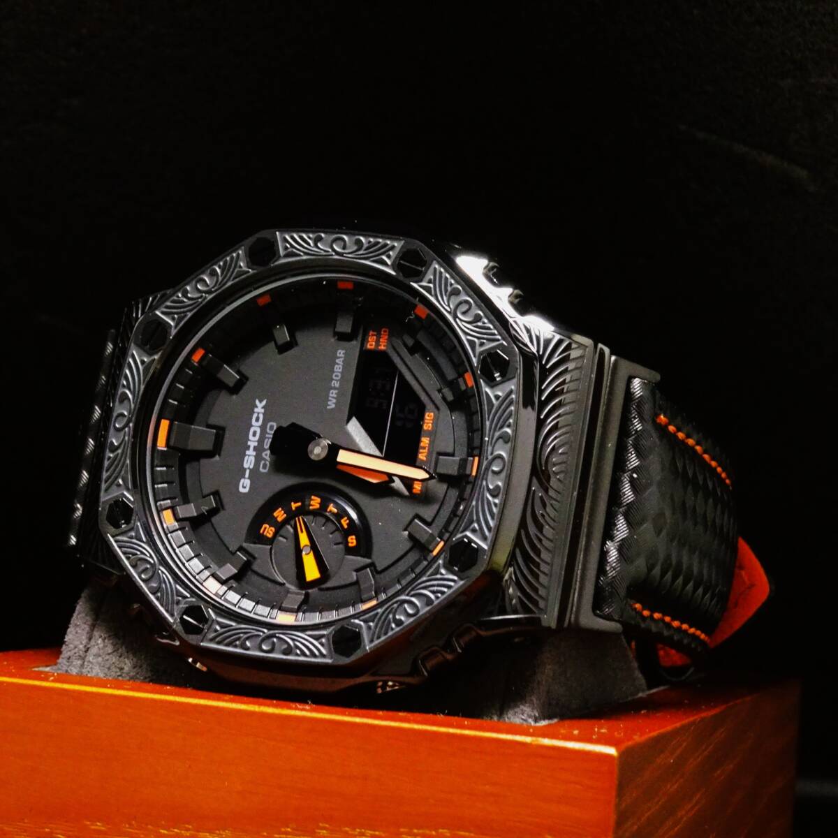 〓新品〓GショックCUSTOM・MADE腕時計〓正規GA2100本体付ステンレス製ベネチアン柄エンボス加工ベゼル〓カーボン柄本革ベルト〓カシオーク