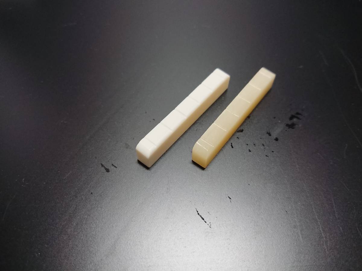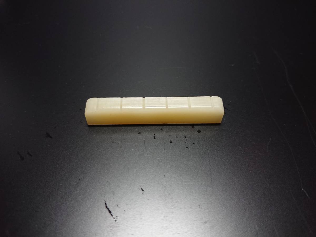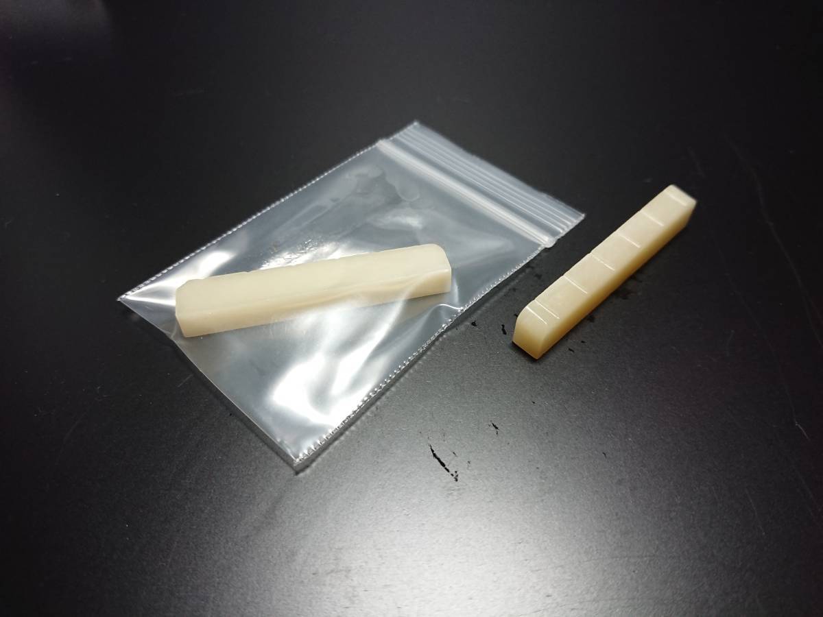 漂白済みのクラシックギター用牛骨成形済みナットを自家製オイルソースで漬けたものです。