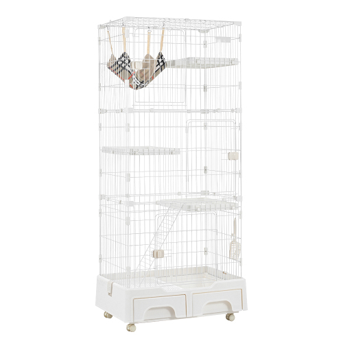 猫 ケージ トイレ付 ハンモック付 収納型 キャットケージ 3段 1段2段可能 キャスター付 キャットハウス 【ホワイト】