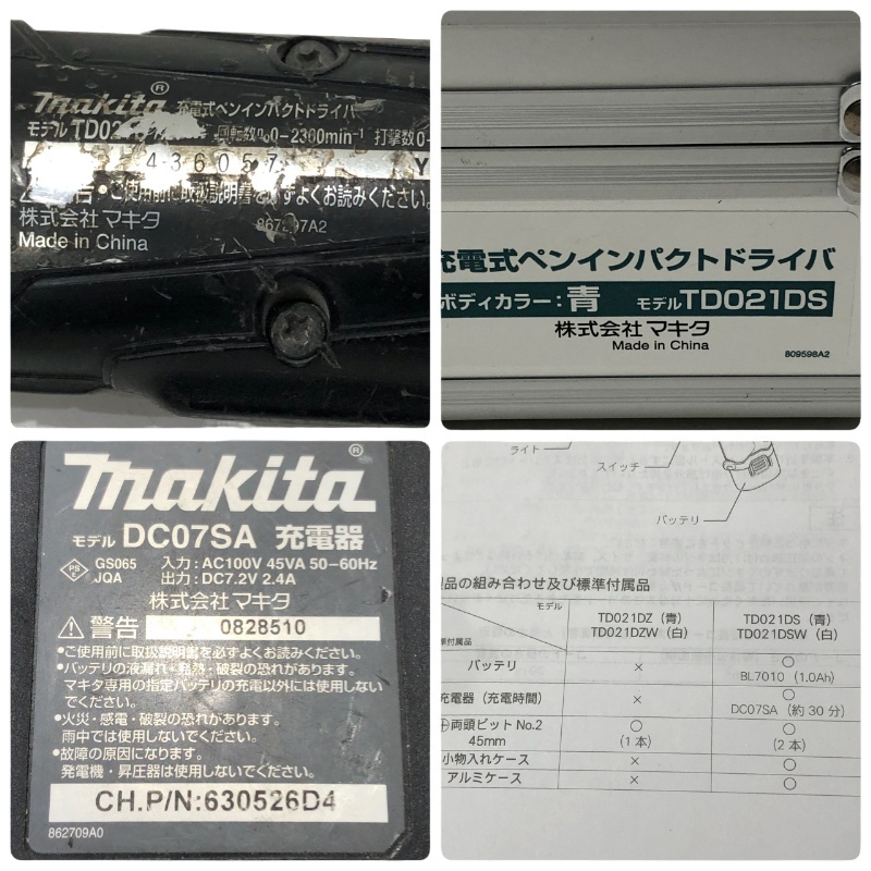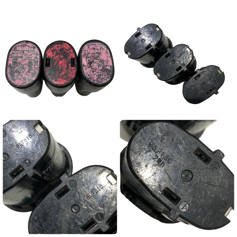 付属品 | ・本体、バッテリBL7010×2個 充電器DC07SA ・専用ケース、取扱説明書付属 ・おまけ…画像のビット3本(標準付属品ではございません) ・おまけ…バッテリ1点型番不明(本体にセット稼働確認済) ※内部小物入れケース、標準付属ビットは2本とも欠品のため付属はいたしません※ ※バッテリはいずれもラベルの損傷が激しいですが 標準付属の2点は底面に型番が確認できます。 なおおまけバッテリ1点は底面の型番が確認できておりません。 |
