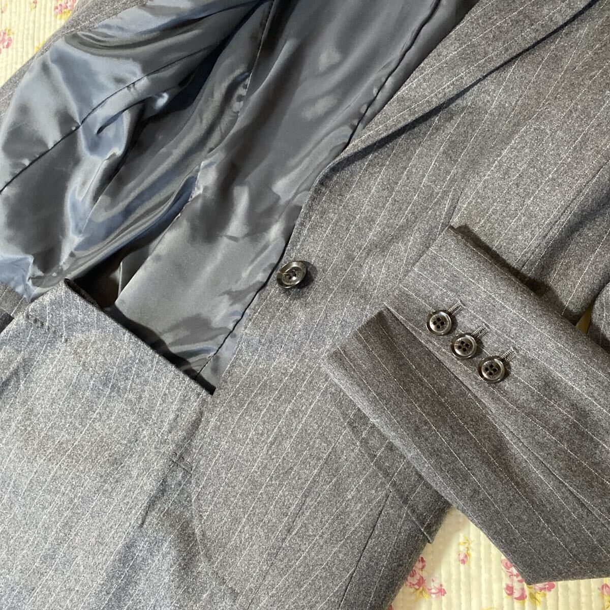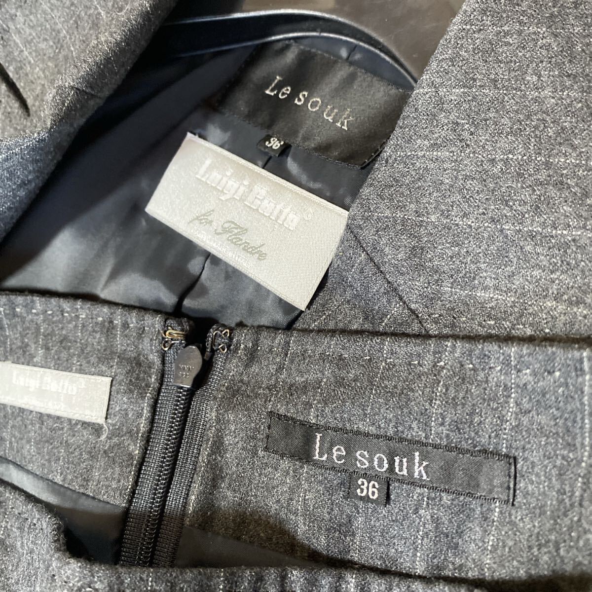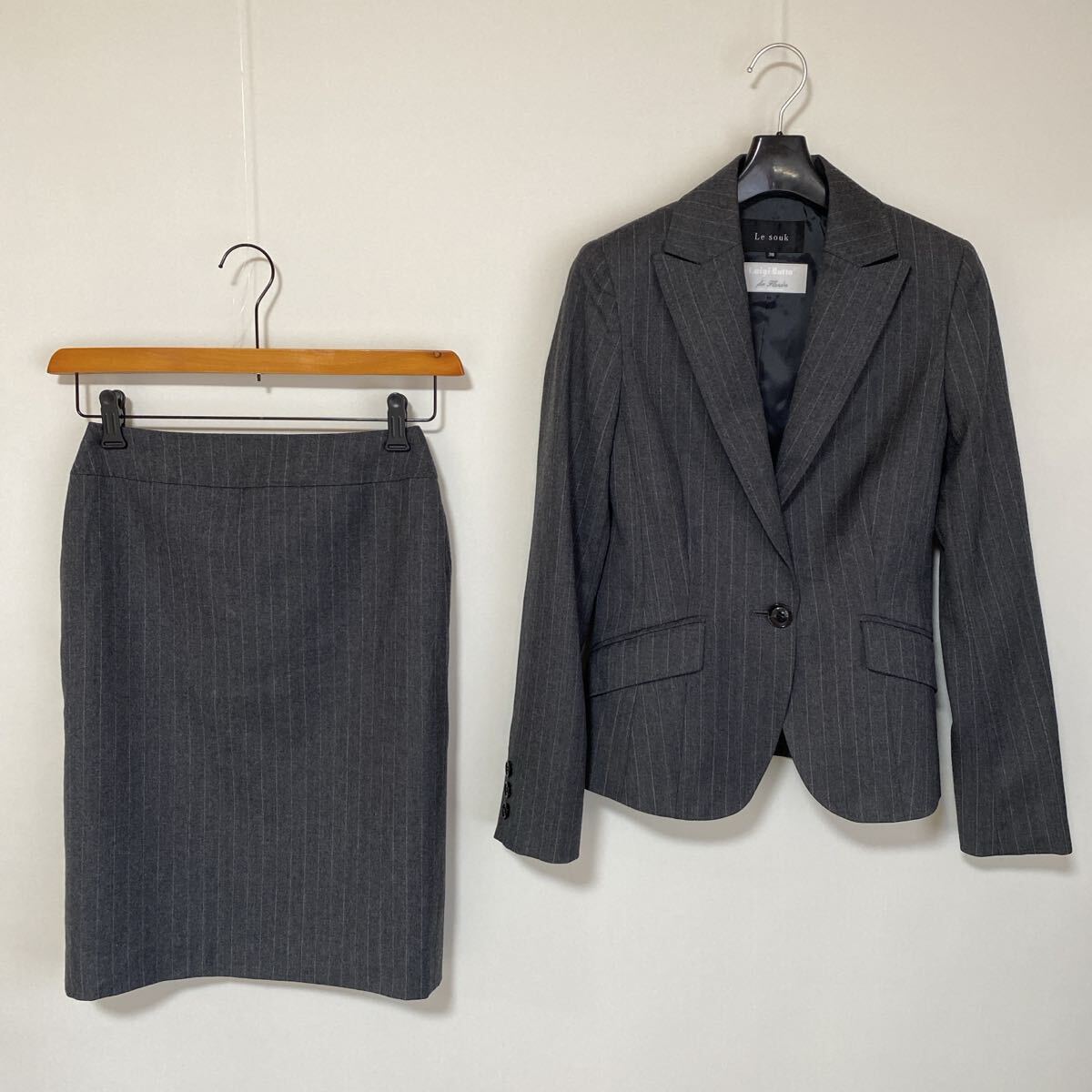ルスーク(LE SOUK)のお品です。上品で、清楚な雰囲気で着こなせます。面接、ビジネス、学校行事にお勧めです。お色は画像でご確認下さい。グレーストライプです。総裏仕立てです。1つボタン。袖口にボタンが3つ付いています。センターベント。ジャケット、外ポケット×2。内ポケット×1。スカート、センターバックファスナー、背面、ポケット×2。スリットあり(背面、約18センチ)。染み、汚れ、ほつれのない【新品同様】のとてもきれいなスカートスーツです。襟周りや袖口に擦れや汚れのないお品なので、サイズの合う方に是非お勧めします。日本製。maid in japan