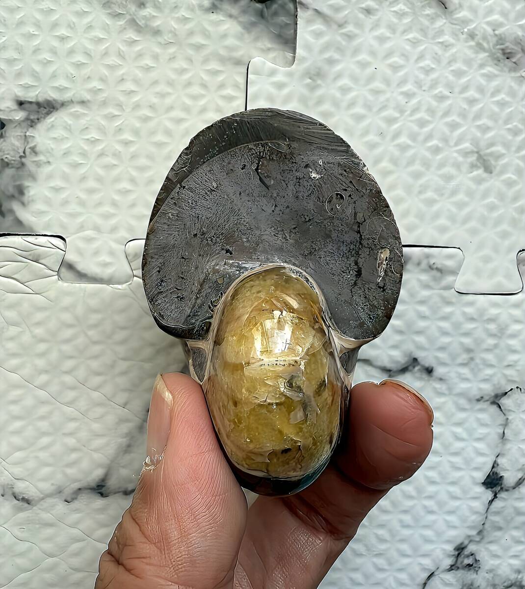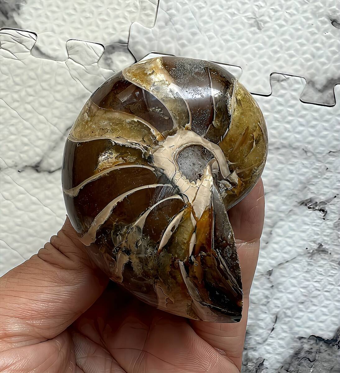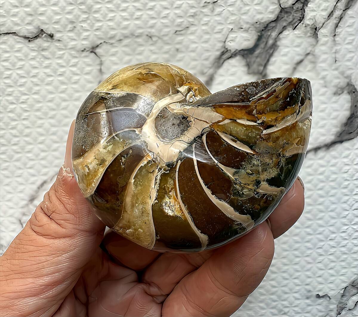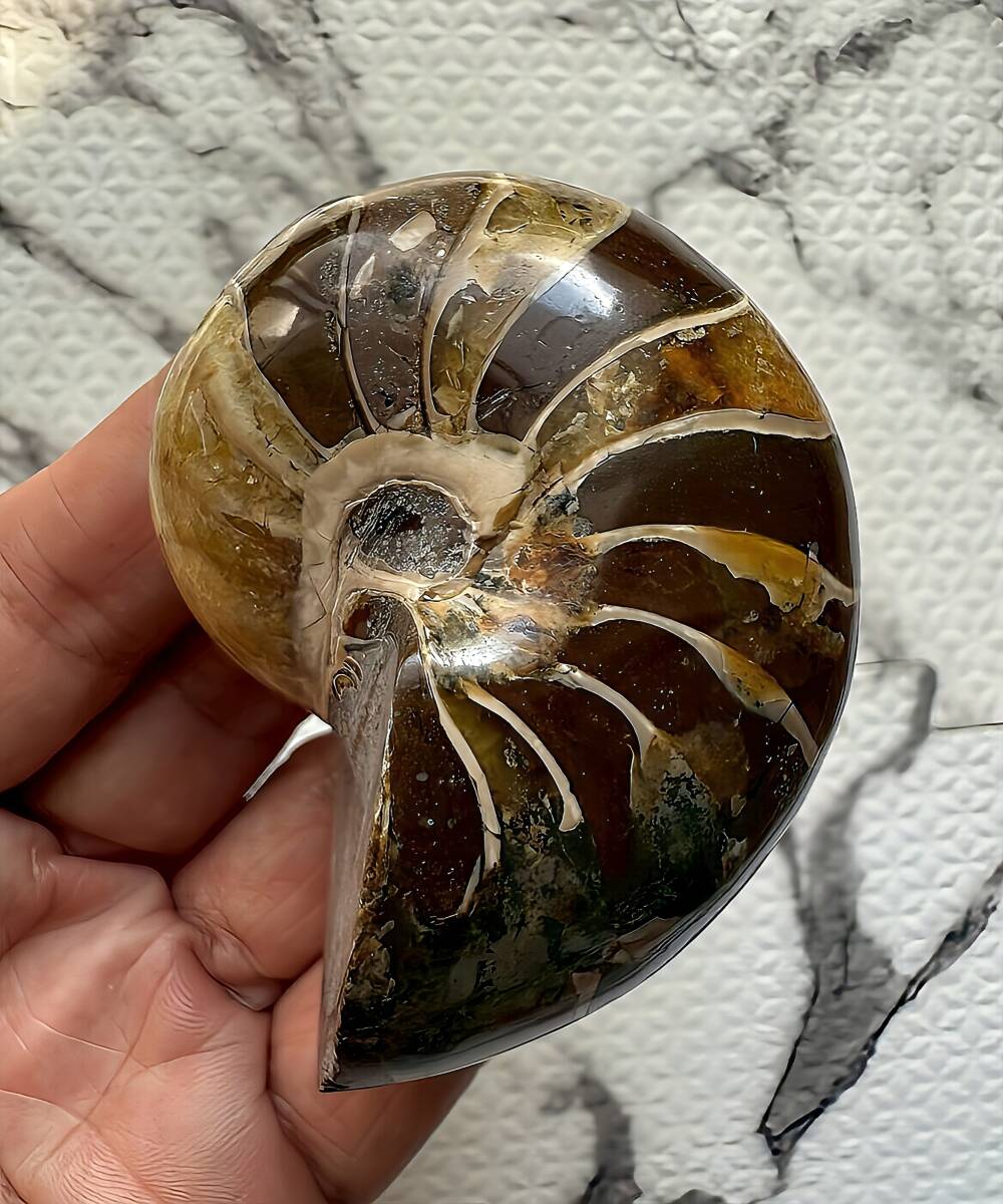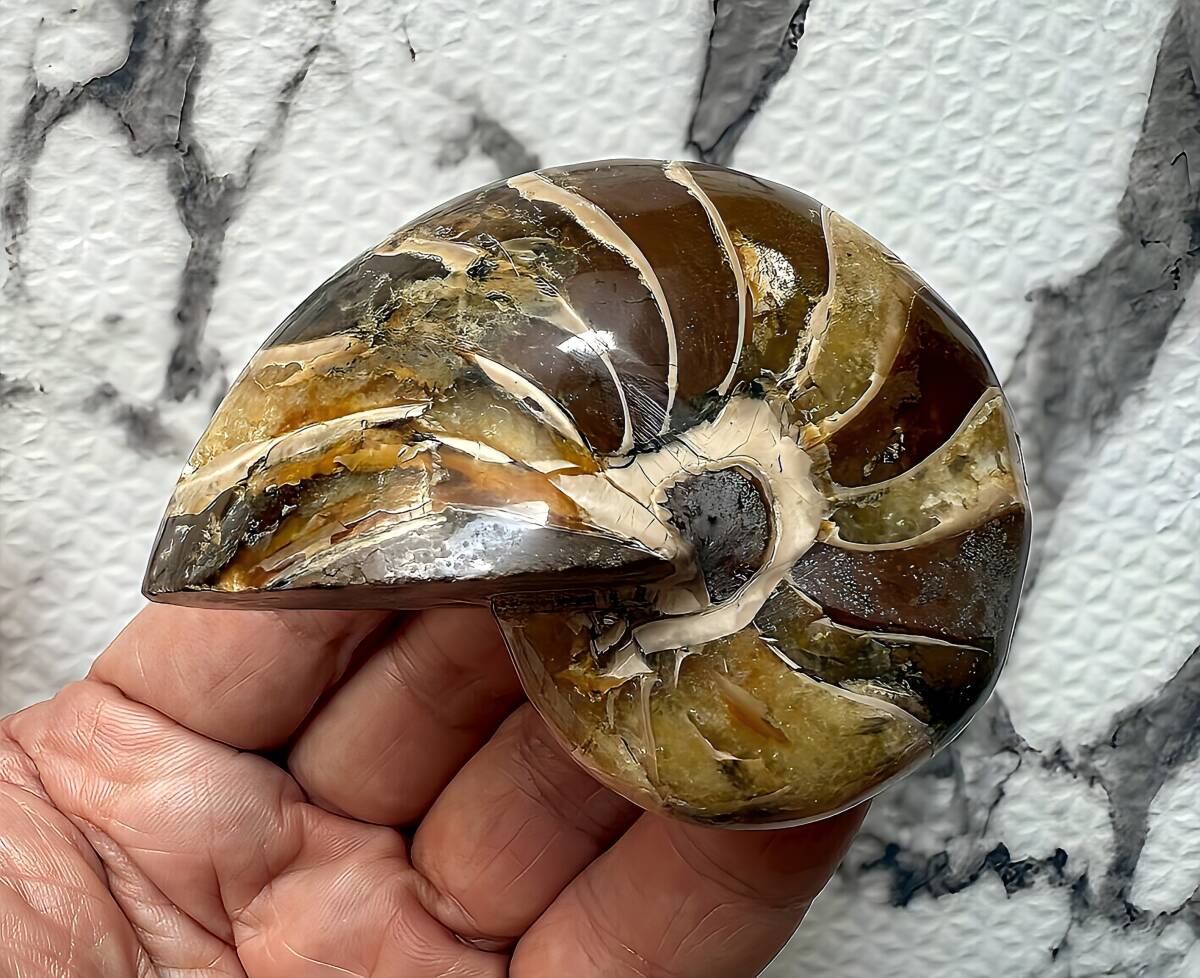 ☆ | 商品名:マダガスカル産キマトセラス、オウムガイ(アンモナイト近似種)中サイズ 仏語名:Nautilus Cymatoceras ■原産地 マダガスカル、マハジャンガ産 ■サイズ・重さ:7.1cm 167g ■マダガスカル産オウムガイ(Nautilus Ammonite)は、古生代シルル紀末期(もしくは、デボン紀中期)から中生代白亜紀末までのおよそ3億5,000万年前後の間を、海洋に広く分布し繁栄した、頭足類の分類群の一つと言われています。全ての種が平らな巻き貝の形をした殻を持っているのが特徴です。 本化石はマダガスカルにて採取され、採鉱職人によって1個ずつ丁寧に研磨加工されています。化石コレクターの方、オパール化アンモナイト(Nacre)とは異なる化石はいかがでしょうか。 ■配送方法:レターパックプラス ■送料負担:落札者 ■発送元:東京都 ■海外発送:対応不可 ■発送日までの日数:入金手続き当日発送 ●注意事項● ■ まとめて取引は可能な限り対応します。発送方法の変更が不可な場合はお断りする場合がございますが、同梱にて2点目以降送料無料対応いたします。 ■支払期限については原則2日以内にお願いします。 ■ノークレーム、ノーリターンでお願いしておりますので化石商品の性質をよく御理解した上で入札をお願い致します。 ■評価の悪い方の入札は取り消します。 ■商品は天然物につき画像には映らない多少のキズ、欠け等がある可能性、またカメラの性能や光の具合によって現物との色の違いが若干ある場合がございます。写真コメントで説明していますが、伝わらない点についてはご了承願います。撮影には一切照明を使用せず、日中の自然光で撮影をしています。 | ★ | |||||||