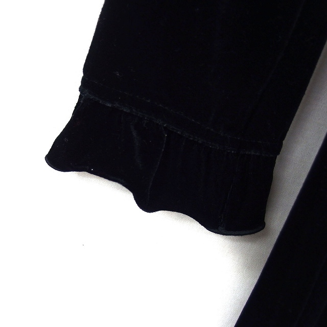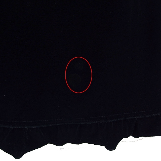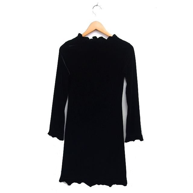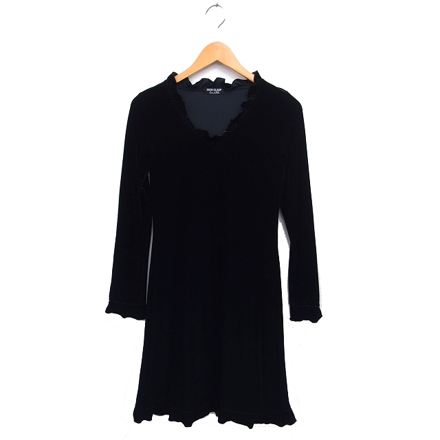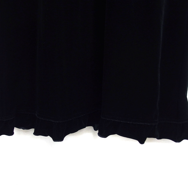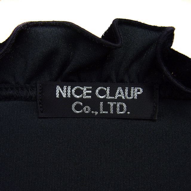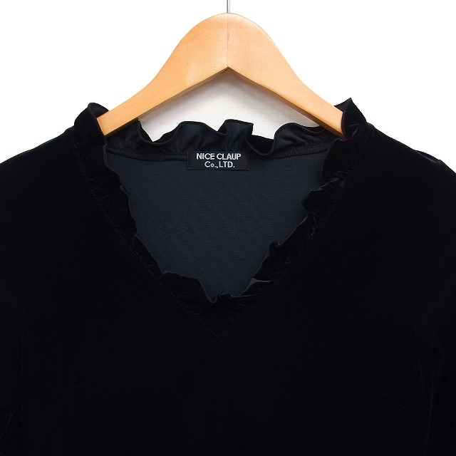 ナイスクラップ NICE CLAUP フリル ベロア ワンピース フレア ひざ丈 Vネック 長袖 黒 ブラック /NT5 レディース