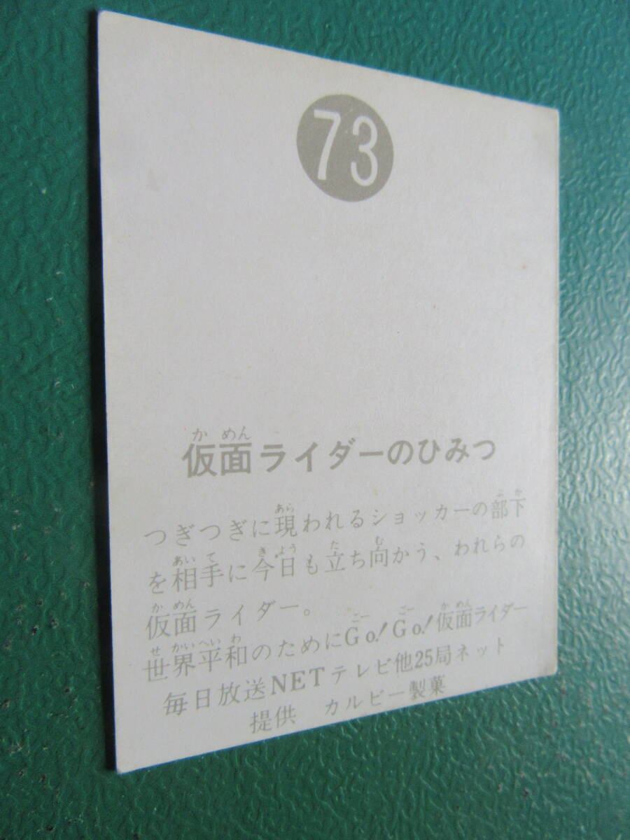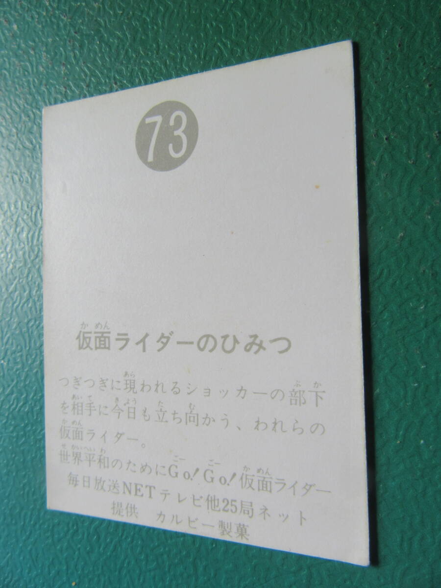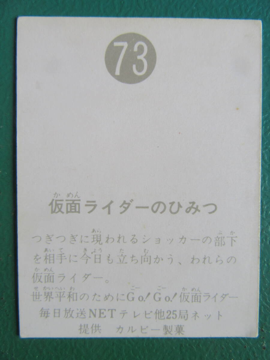 写真のカードです、今から50年以上前のカルビー仮面ライダースナックに付いていた、伝説のライダーカード、当時物、本物です。初期番号をお探しの方はコレクションにどうでしょうか。