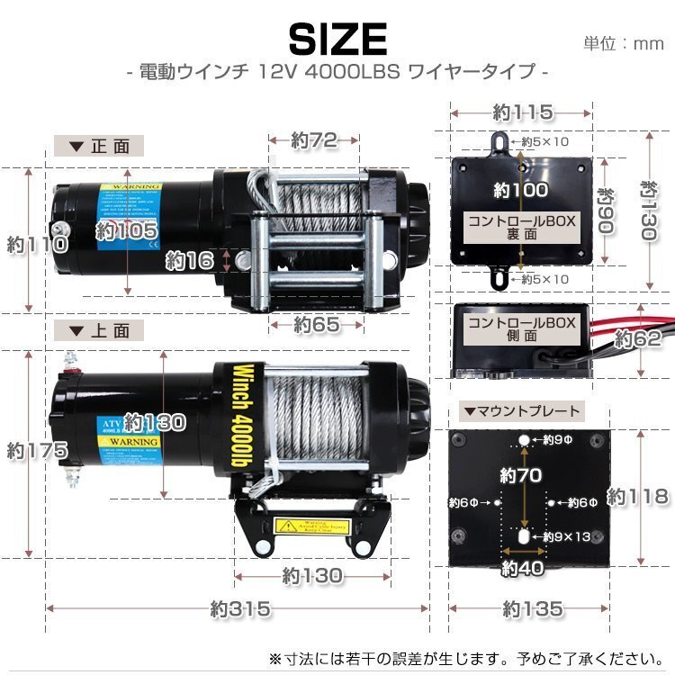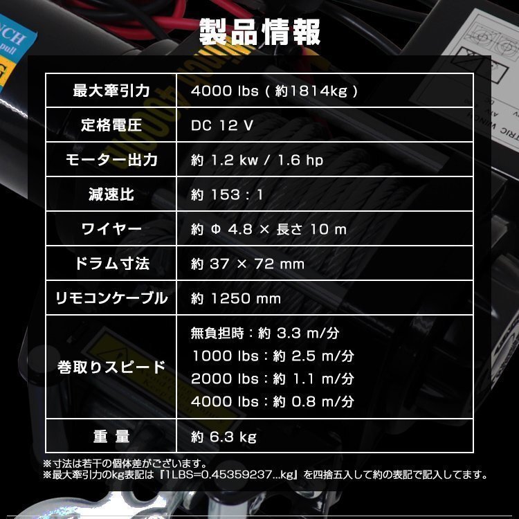 最大牽引力1814kg! ジェットスキー、ボートや重量物を引き上げる際にとても便利な電動ウインチです。 カー電源対応!車のDC12Vバッテリーに繋げて使用します。 無線リモコン付なので、車両から離れてのウインチコントロール、牽引対象物側でのウインチコントロールが可能。 半永久的使用可能なマグネット式モーターを採用。 巻き上げすぎ防止機能付です。 ※本製品は水平に牽引する仕様です。上下の荷揚げはできません。 【商品仕様】 巻き上げ重量:4000LBS(1814kg) 定格電圧:DC12V ギア比:153:1 モーター出力:1.2kw / 1.6hp ワイヤー(約):直径 4.8mm、長さ 10m ドラムサイズ(約):直径 37mm、長さ 72mm サイズ(約):長さ315×幅110×高さ175mm 重量(約):6.3kg 巻き上げすぎ防止機能付 防水仕様 【巻取りスピード】 無負担時:(約)3.3m/分 1000lbs:(約)2.5m/分 2000lbs:(約)1.1m/分 4000lbs:(約)0.8m/分 【セット内容】 電動ウィンチ本体 ×1 コントロールBOX ×1 有線リモコン ×1 ガイドローラー ×1 フック ×1 フックストラップ ×1 取り付けネジ一式 ×1 無線リモコン ×1 英語簡易取扱説明書 ×1 (電動ウインチ 12V 電動 ウインチ オフロード車 トラック SUV車 Zeep FJクルーザー DC12V 車 カー 電源 電動 ホイスト 電動ウィンチ 引き上げ機 牽引 けん引 激安 最安値) |