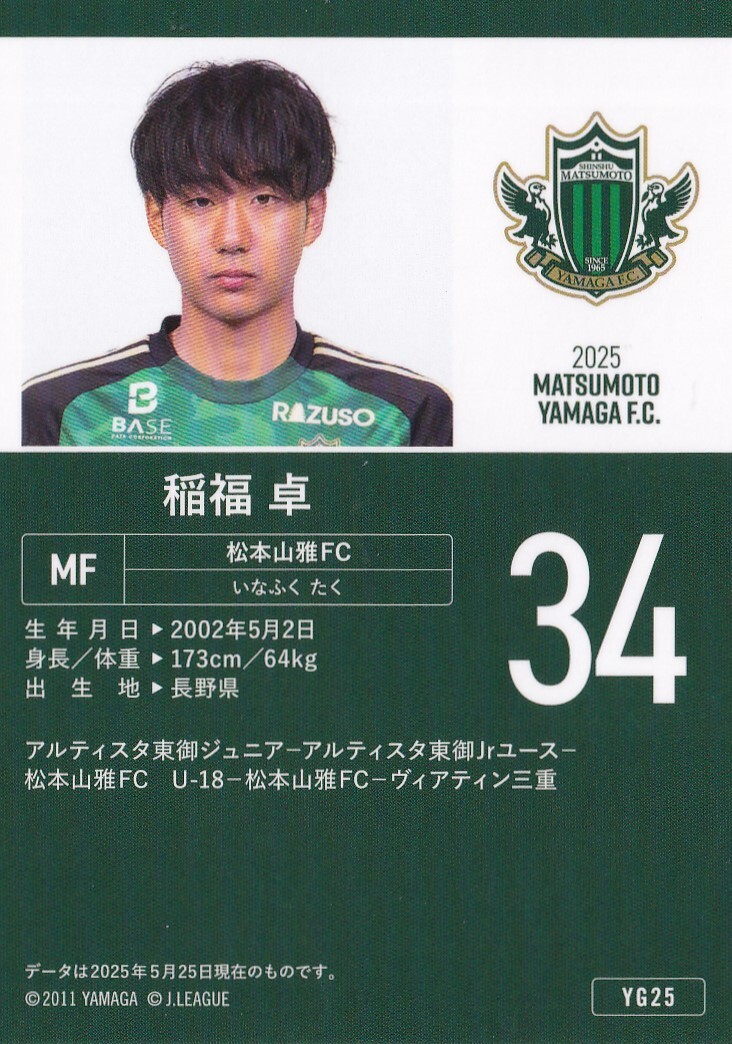 松本山雅FC 2025 オフィシャル YG25 稲福卓