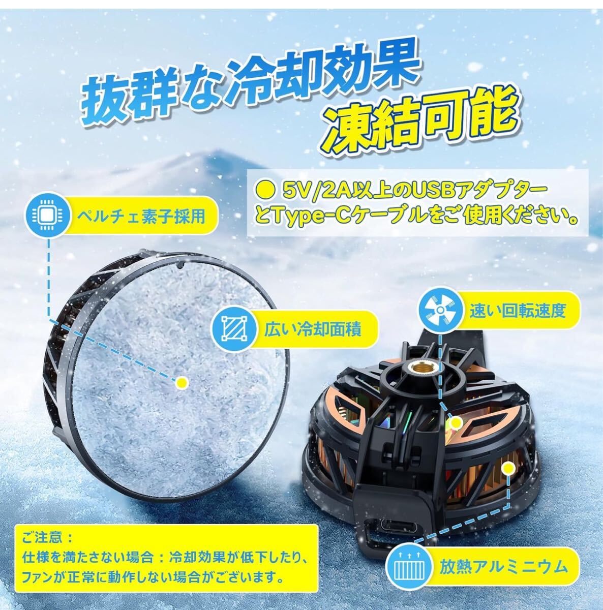 【ご注意】 スマホに固定しない時にスマホクーラーが動作すると、熱伝導メラル板に結露が発生する場合がありますが、通常の現象でございます。5V/2A以上のUSBアダプターと2A以上のType-Cケーブルをご使用ください。仕様を満たさない場合、冷却効果が低下したり、ファンが正常に動作しない場合がございます。 セット内容:Type-Cケーブル+説明書+マグネッシート+静電気シール+クリップ+指サック。