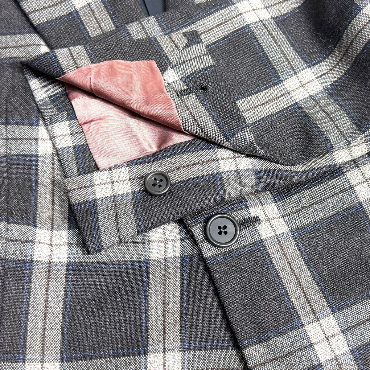 デザイン:フロント二つボタン、総裏地、サイドベンツ、袖比翼本切羽。