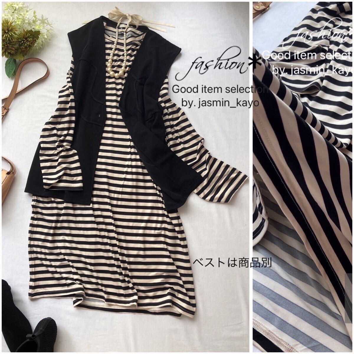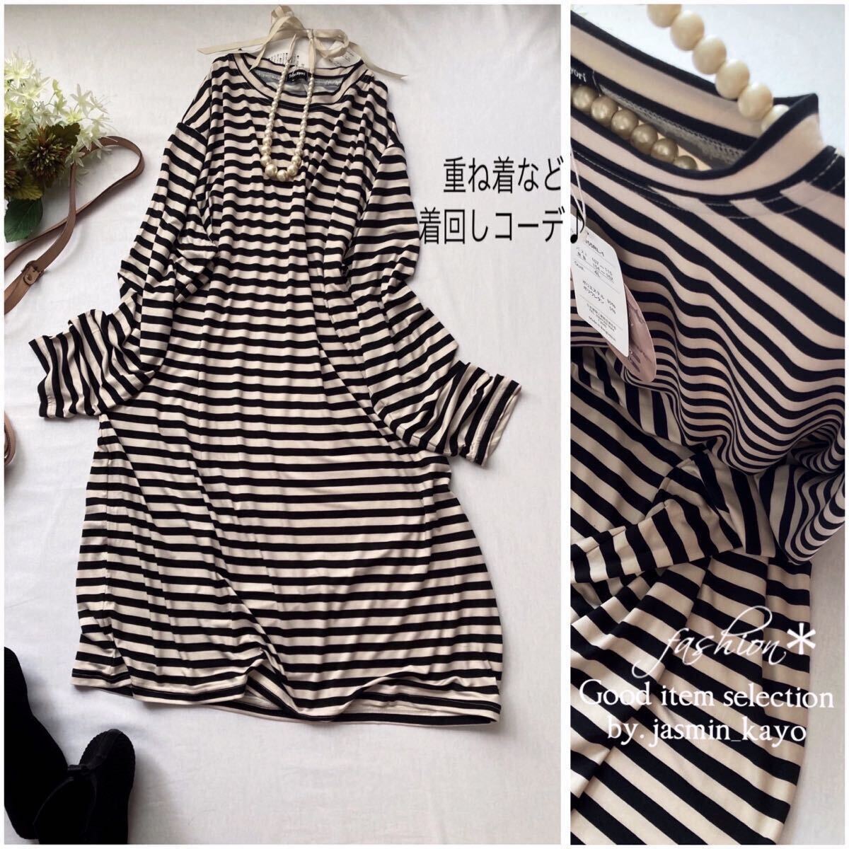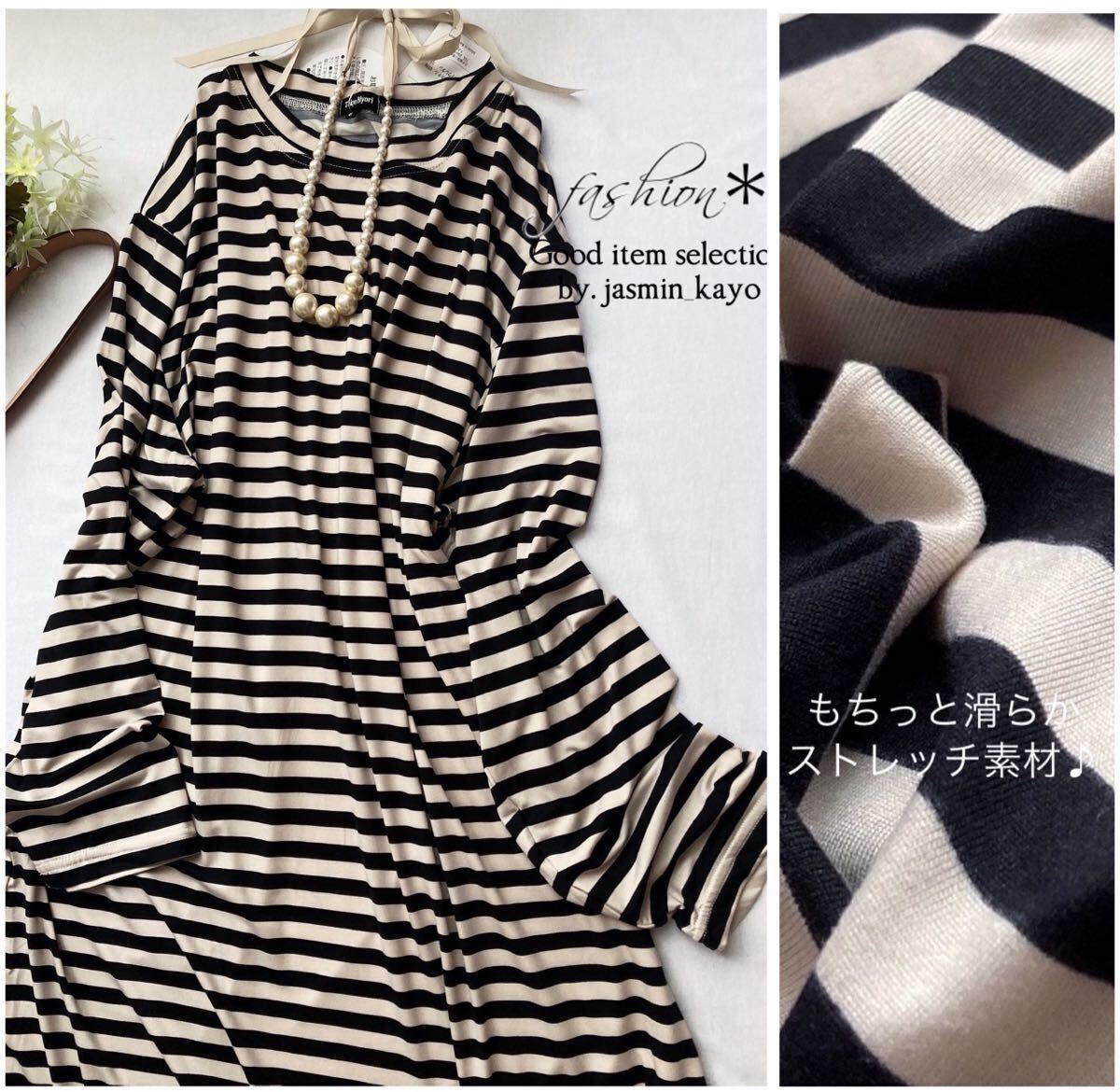 ◆新品4L~3L/LL◆もちっと肌触り滑らかストレッチ素材*色々な重ね着で活躍するボーダーロングチュニック ワンピ tops*黒×オフベージュ