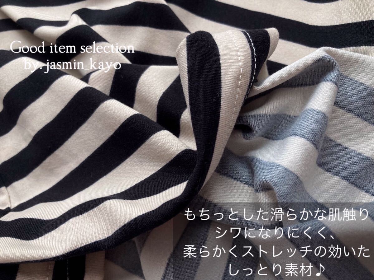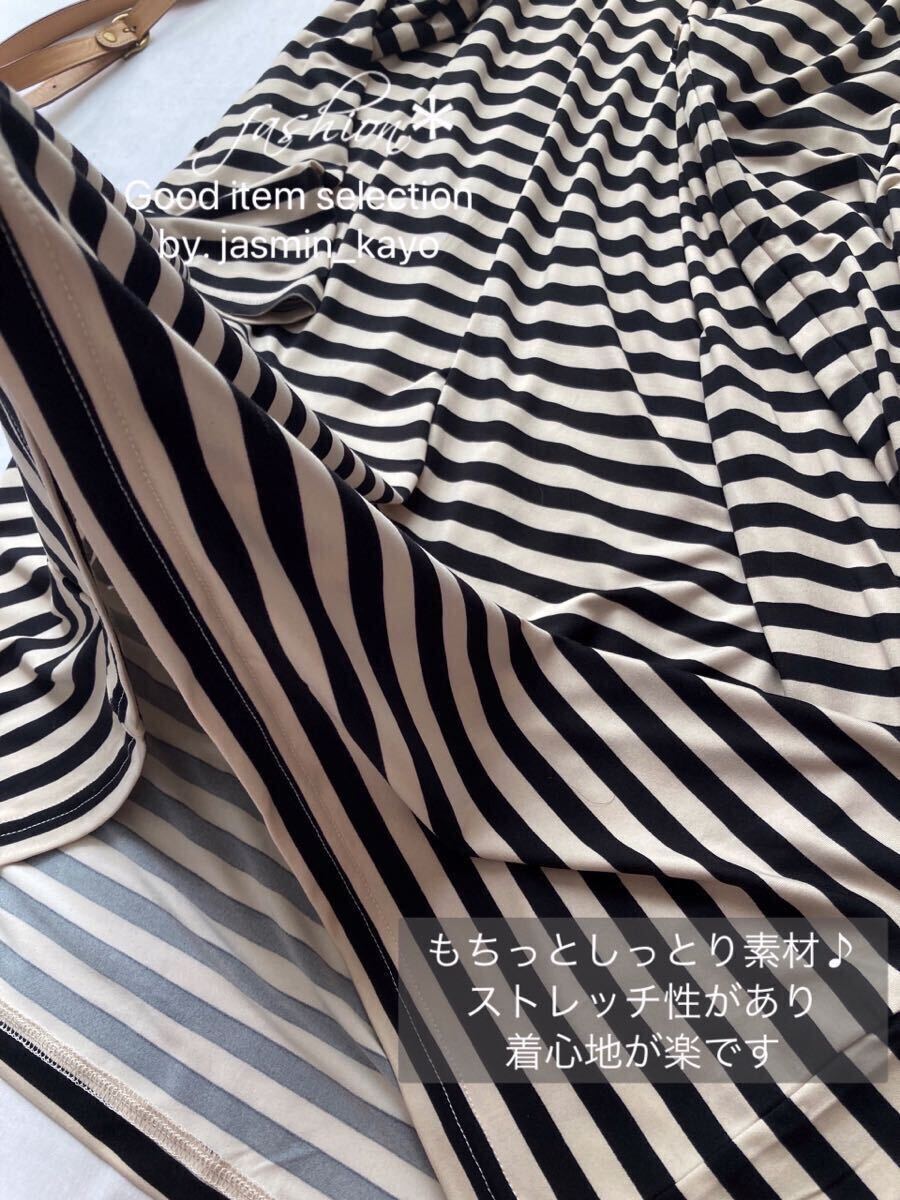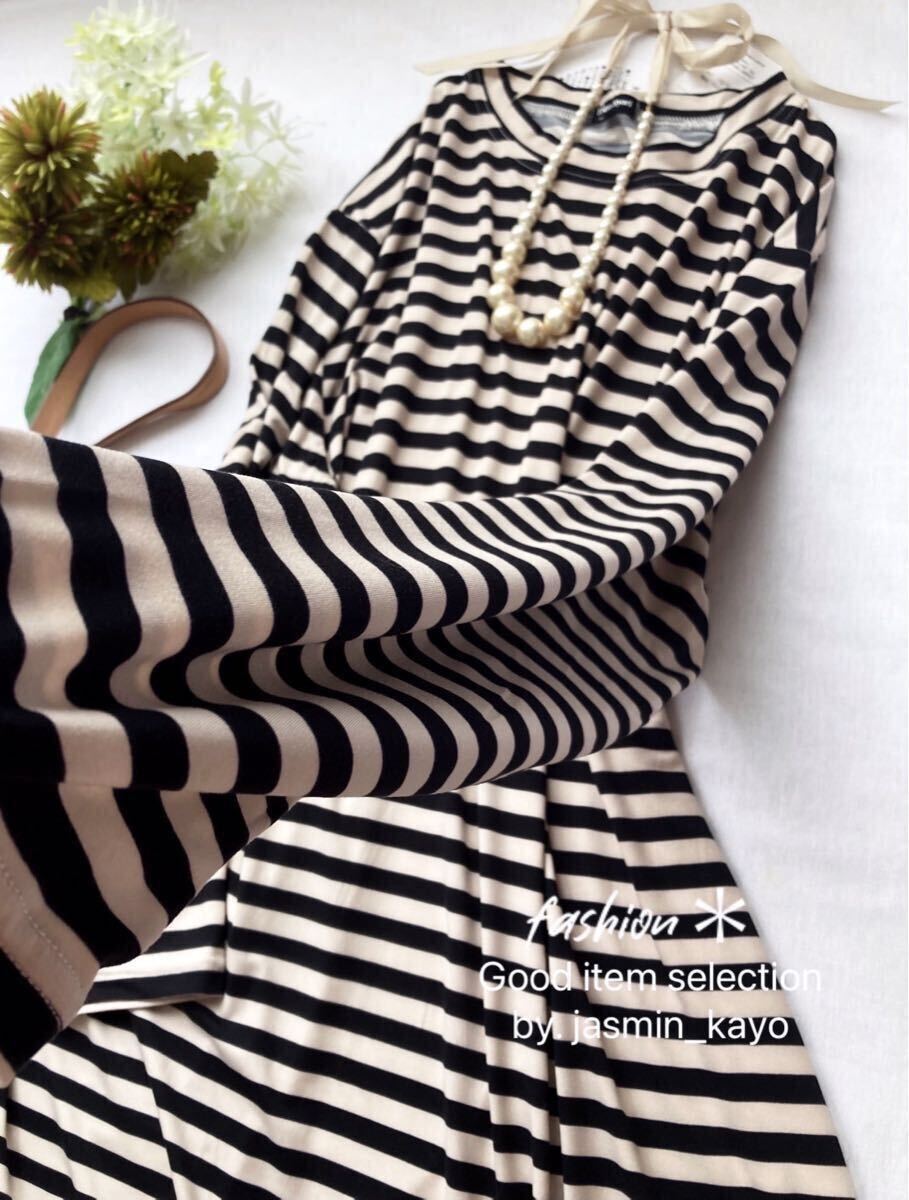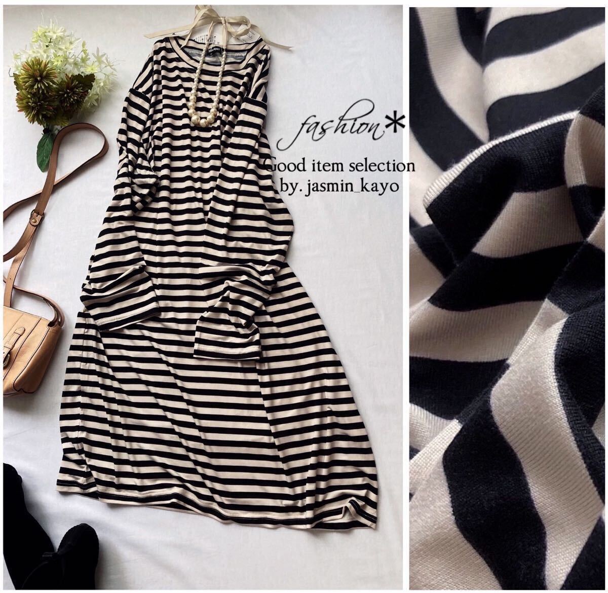 ◆新品4L~3L/LL◆もちっと肌触り滑らかストレッチ素材*色々な重ね着で活躍するボーダーロングチュニック ワンピ tops*黒×オフベージュ