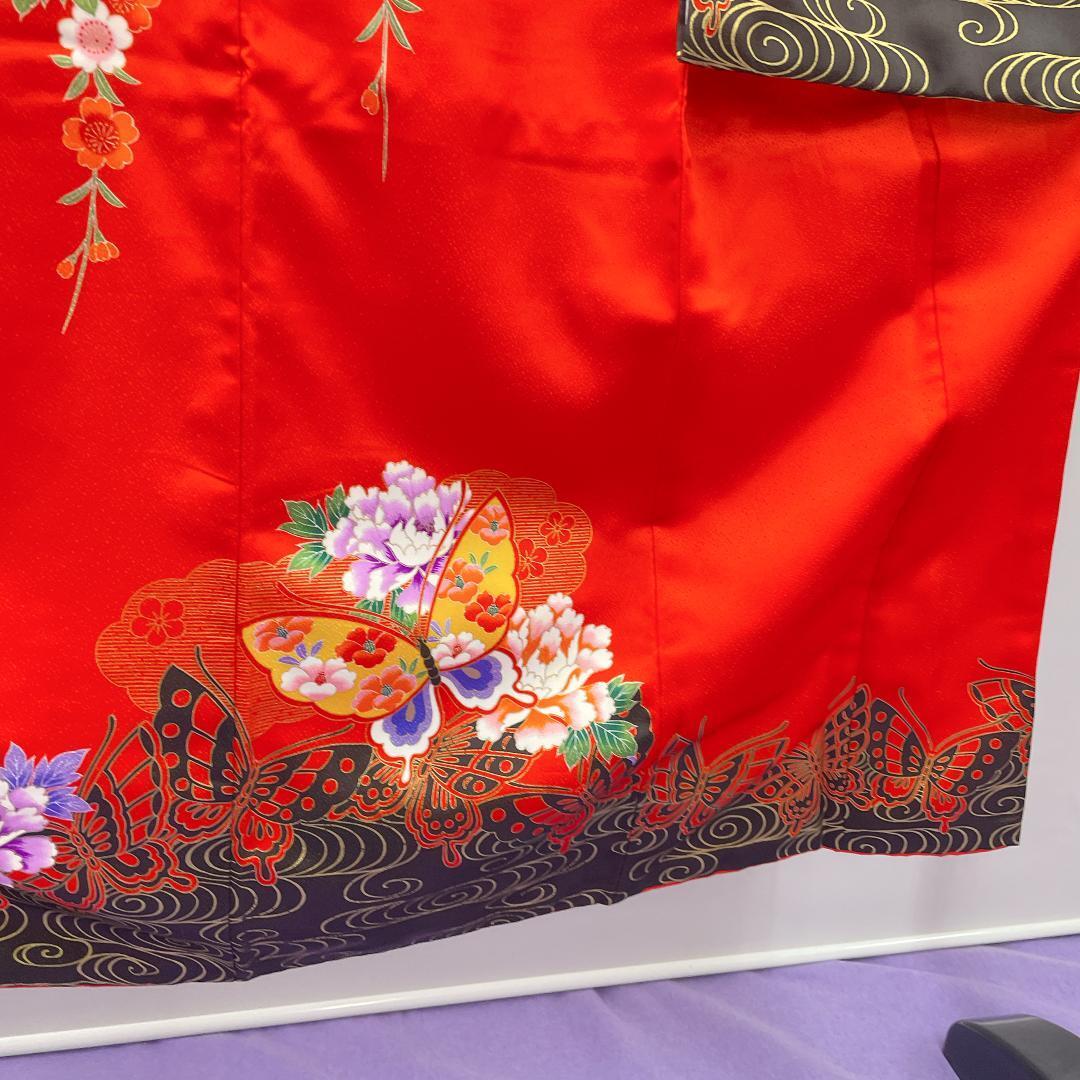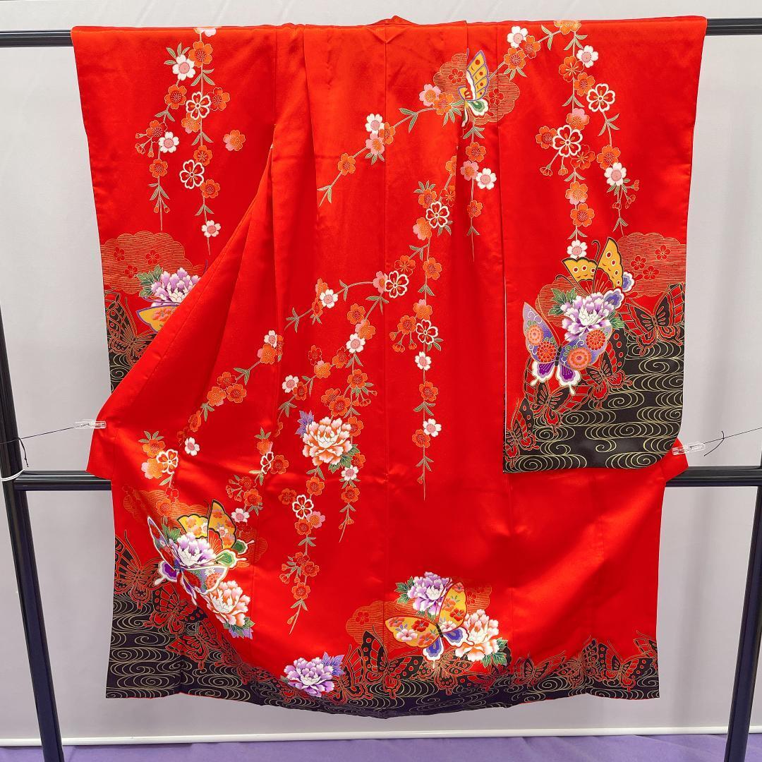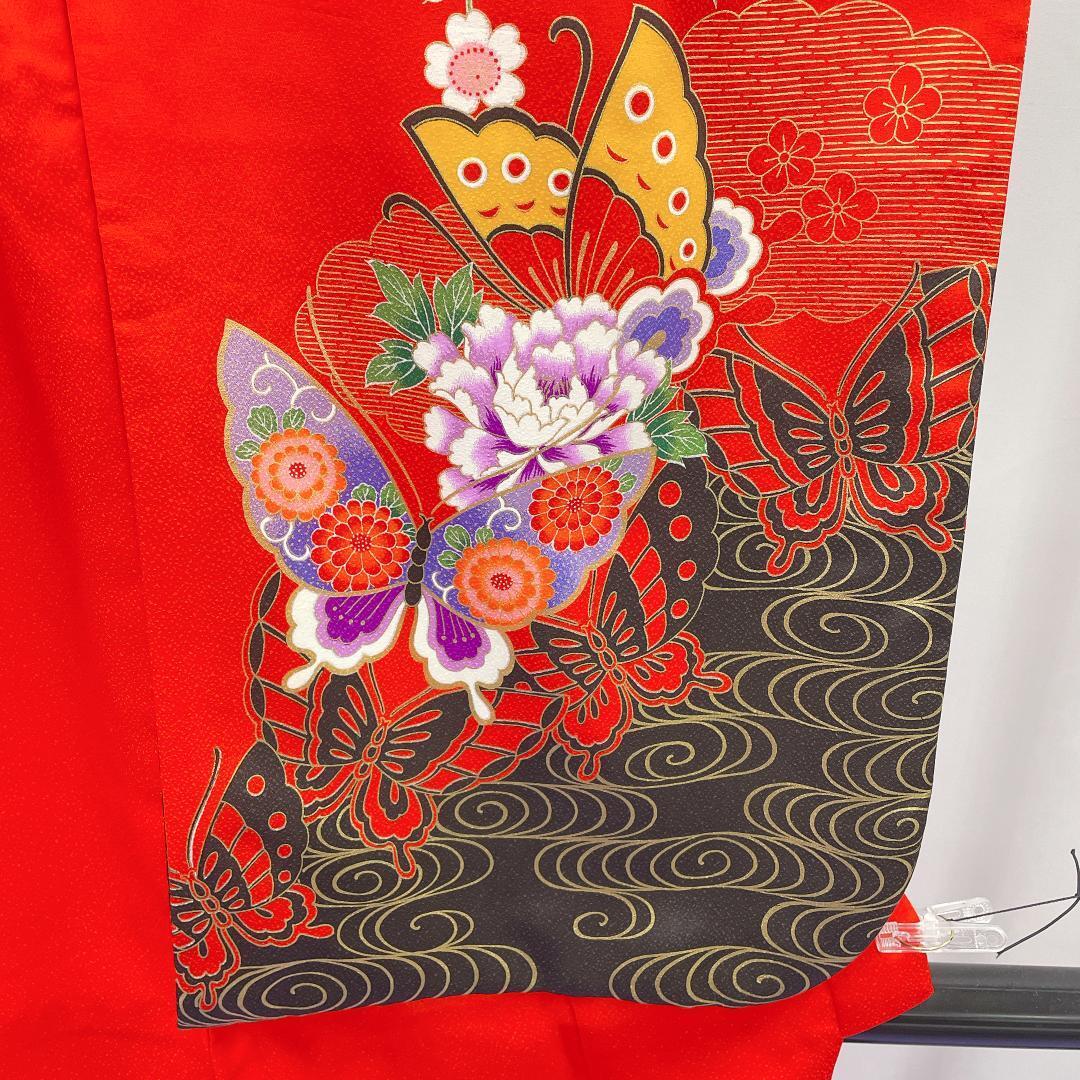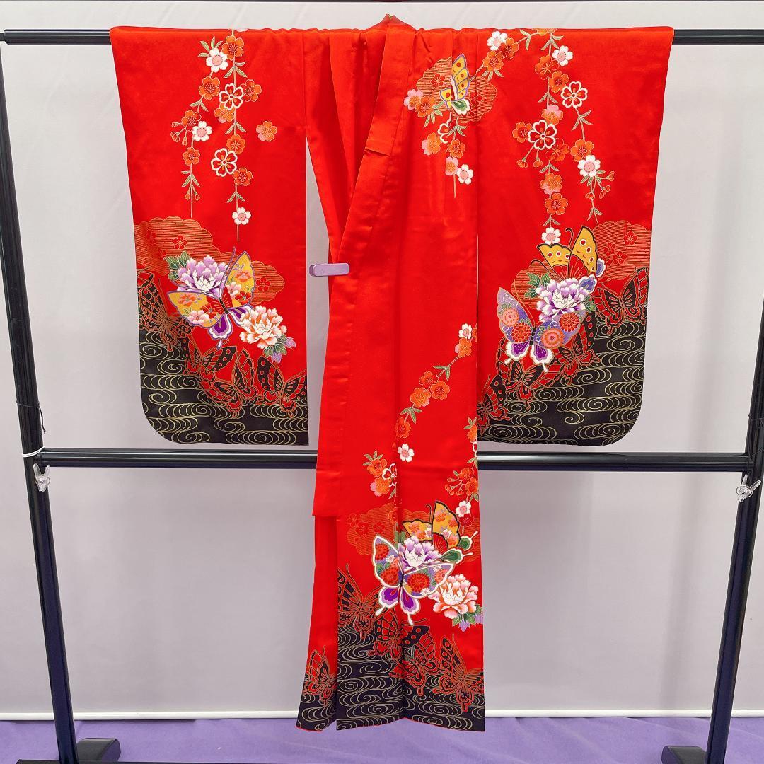 着物は、朱みを感じる、光沢のある赤色です。チョウや花柄が素敵です。