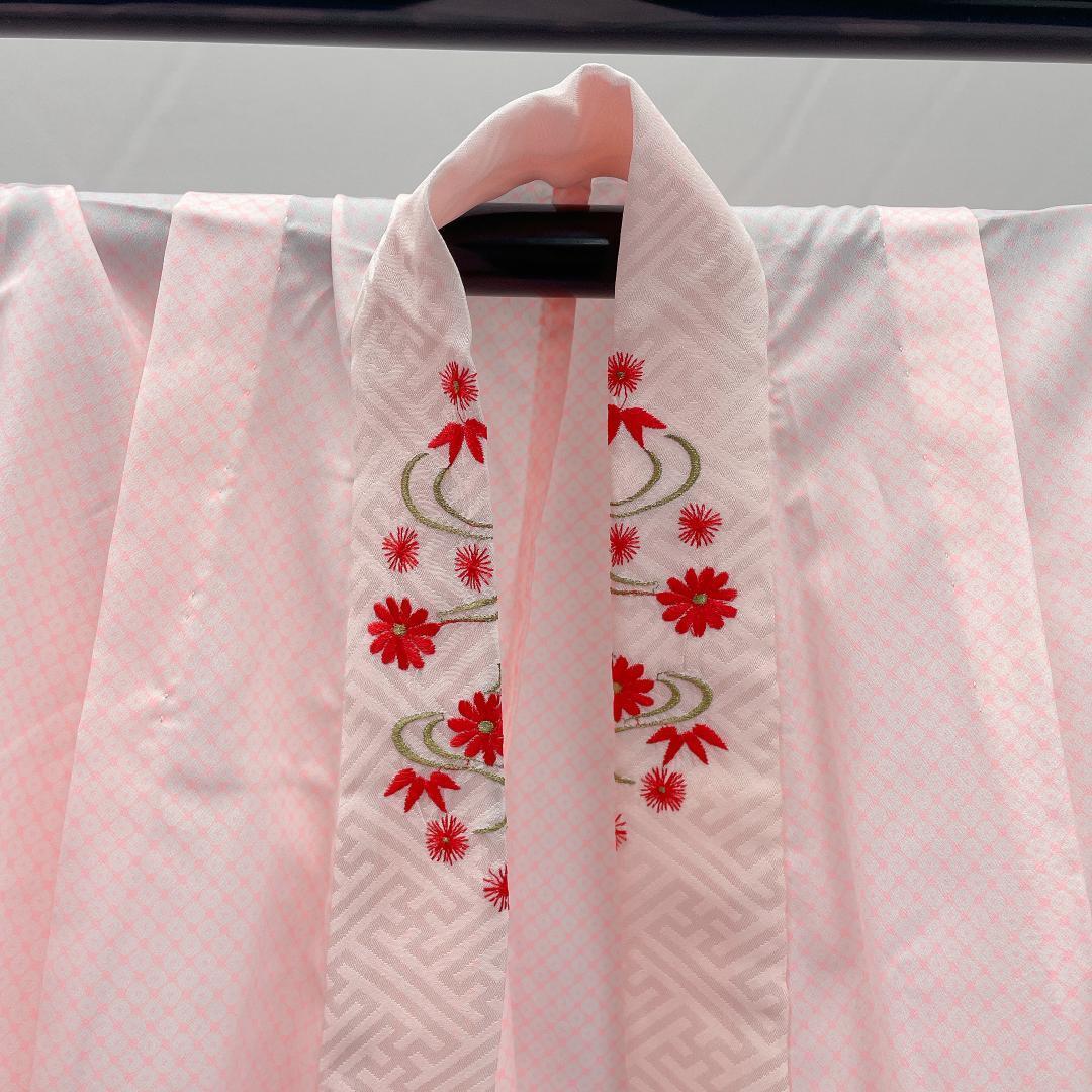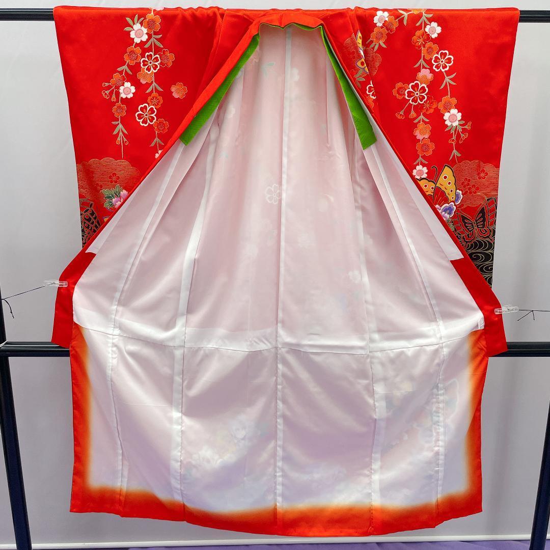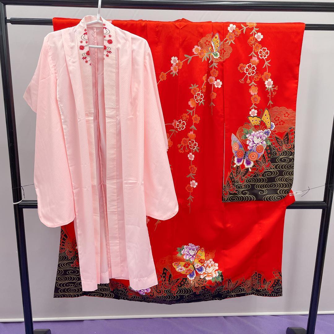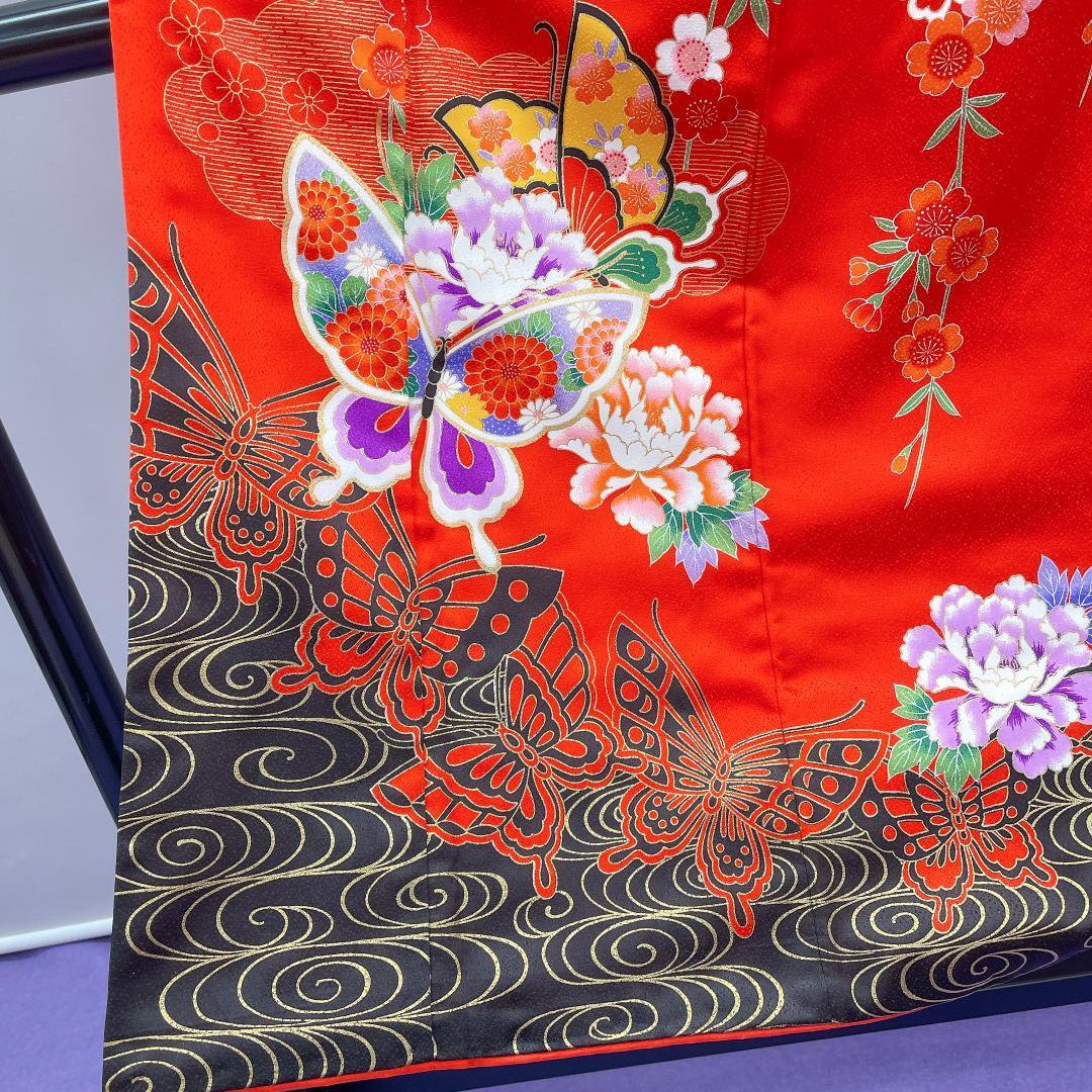 着物は、朱みを感じる、光沢のある赤色です。チョウや花柄が素敵です。