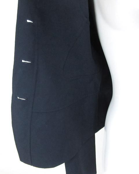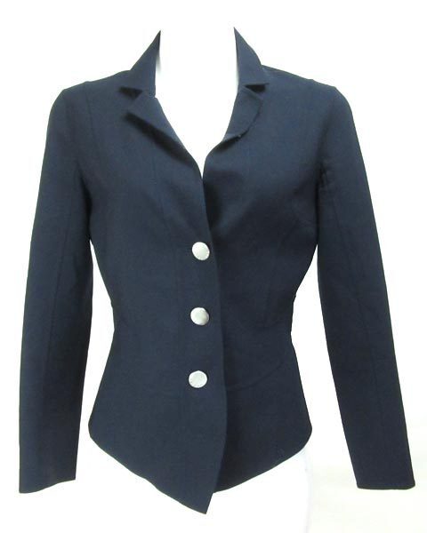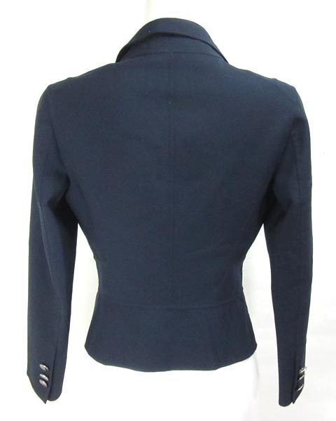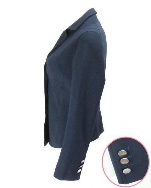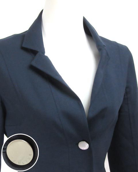 どんなシーンにもマッチするシンプルなジャケット☆落ち着いたカラーにマットシルバーのボタンが素敵です。ボタンにはブランドの刻印があります。前が長く、後ろは短めのデザインです。パンツにもスカートにも相性◎ |