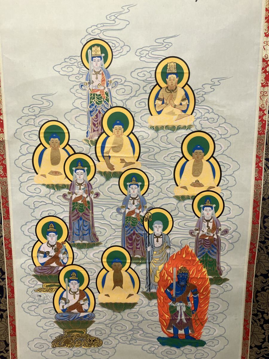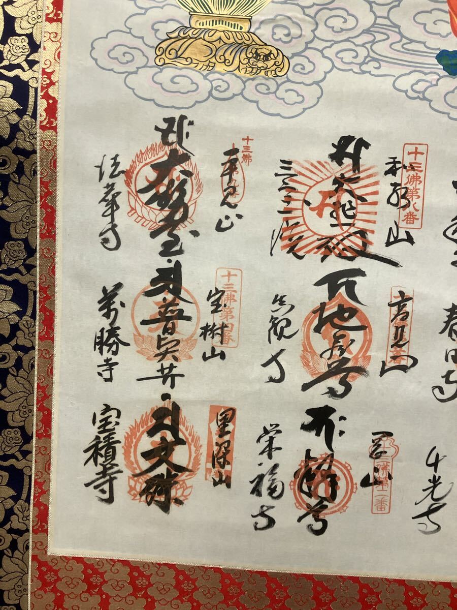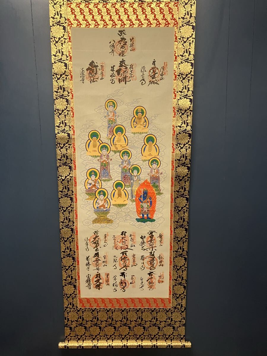商品説明 :十三霊場巡拝記念の掛け軸になります。状態もよく、美品と思われます。共箱、包み紙、紙箱、揃っております。