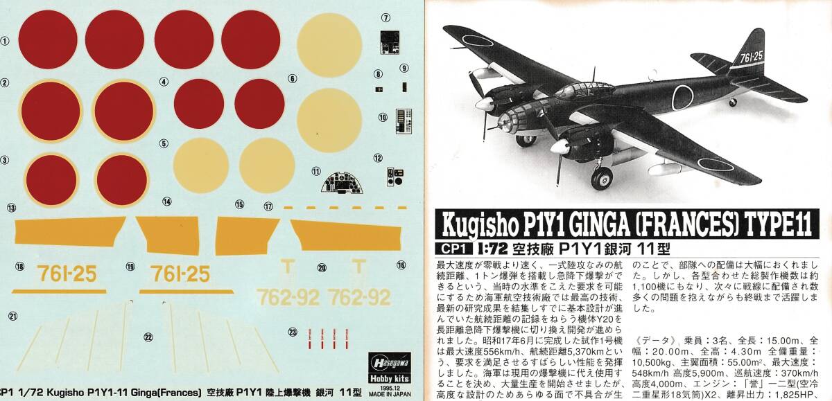 ★1/72 ハセガワ デカール&説明書 セット 海軍航空技術廠 P1Y1 陸上爆撃機 銀河 11型 ‘第761/762海軍航空隊’