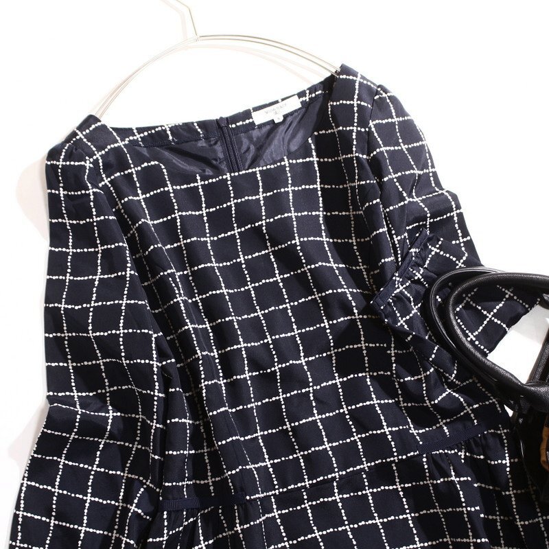 美品 ナチュラルビューティーベーシック 合物 まだら ドット 格子柄 艶 ギャザー ワンピース S ネイビー 紺 ポリエステル オフィス 綺麗め