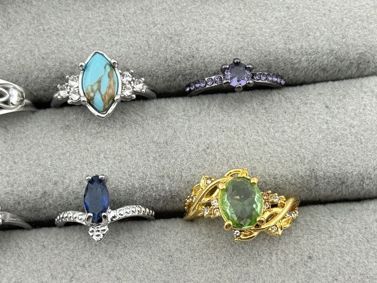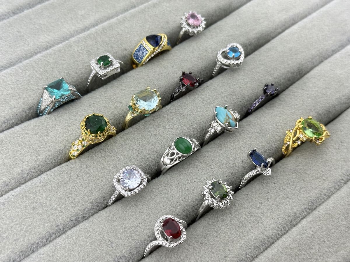天然石、ジルコニア 、カラーストーン、色ガラス、ゴールド、シルバー、ステンレス、真鍮など様々です。
