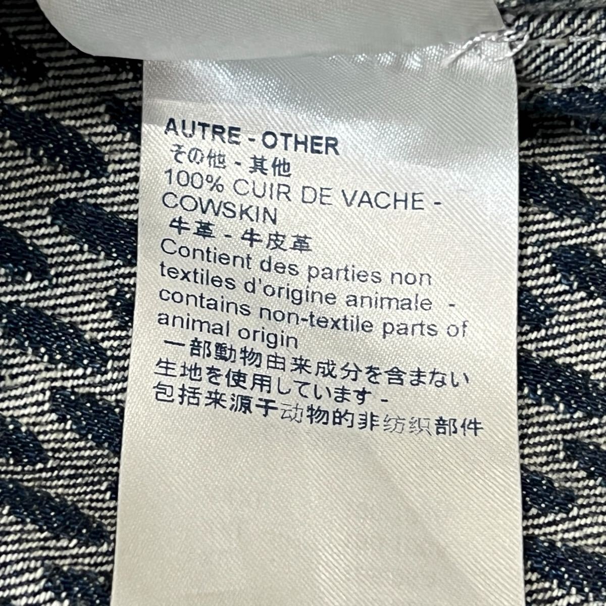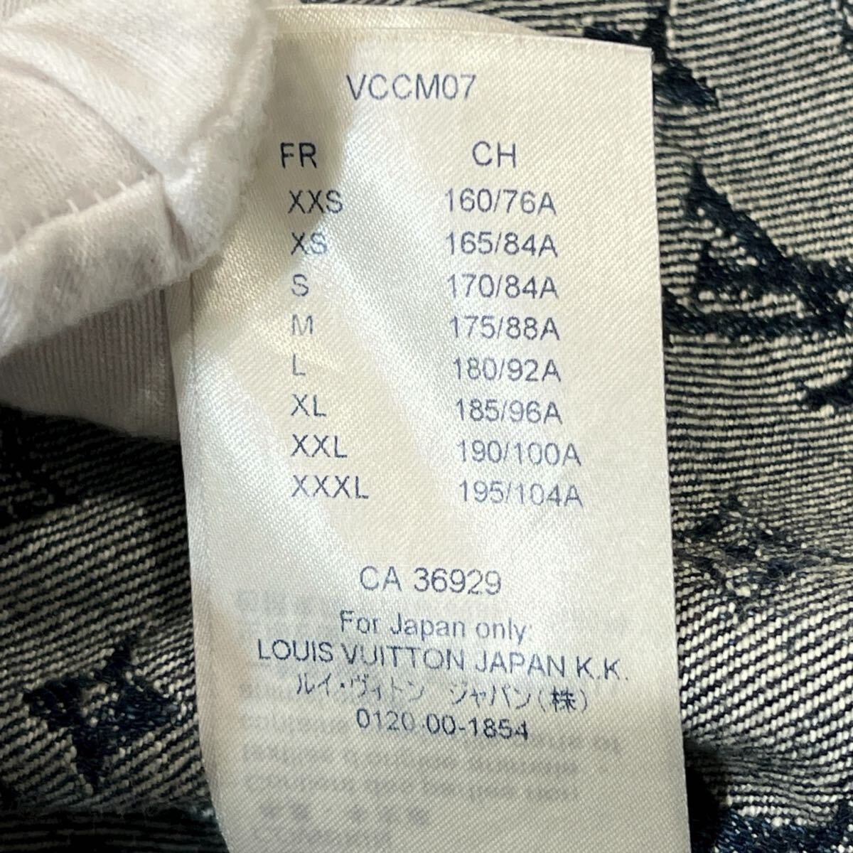 素材は100%コットンデニムを使用し、襟裏や裾にはレザーのアクセント(牛革)があしらわれています。バックには「Louis Vuitton Paris」のロゴが大きく配され、存在感を放つ一着です。
