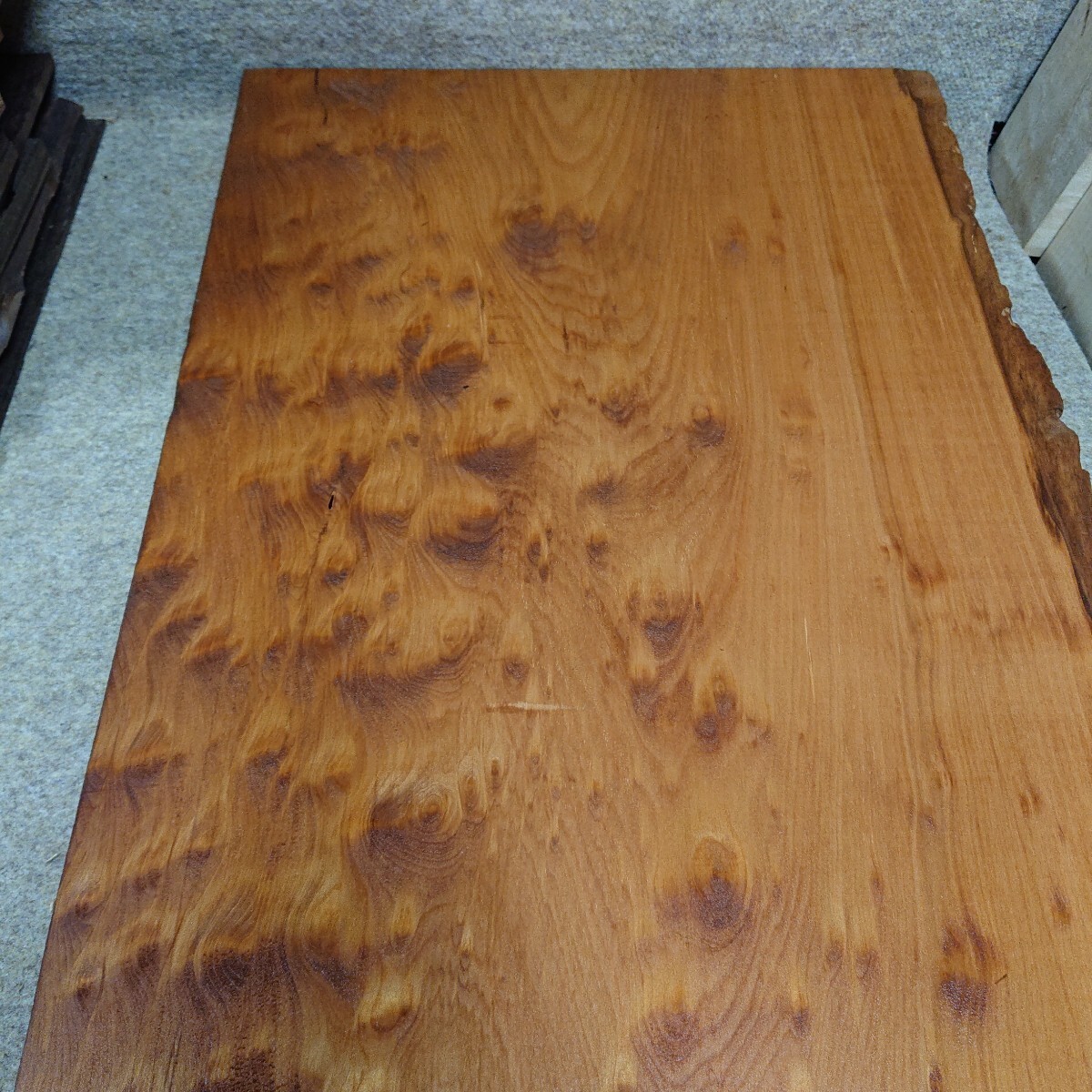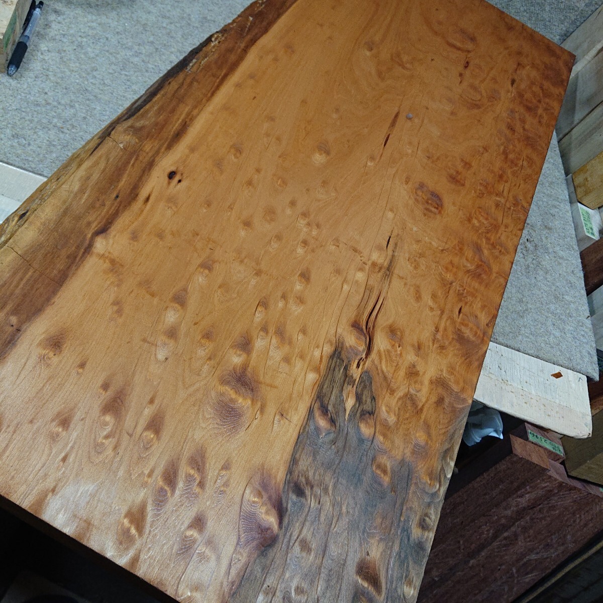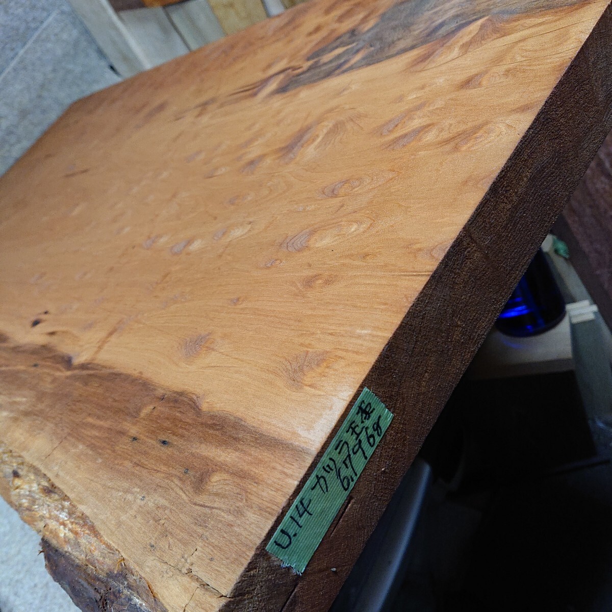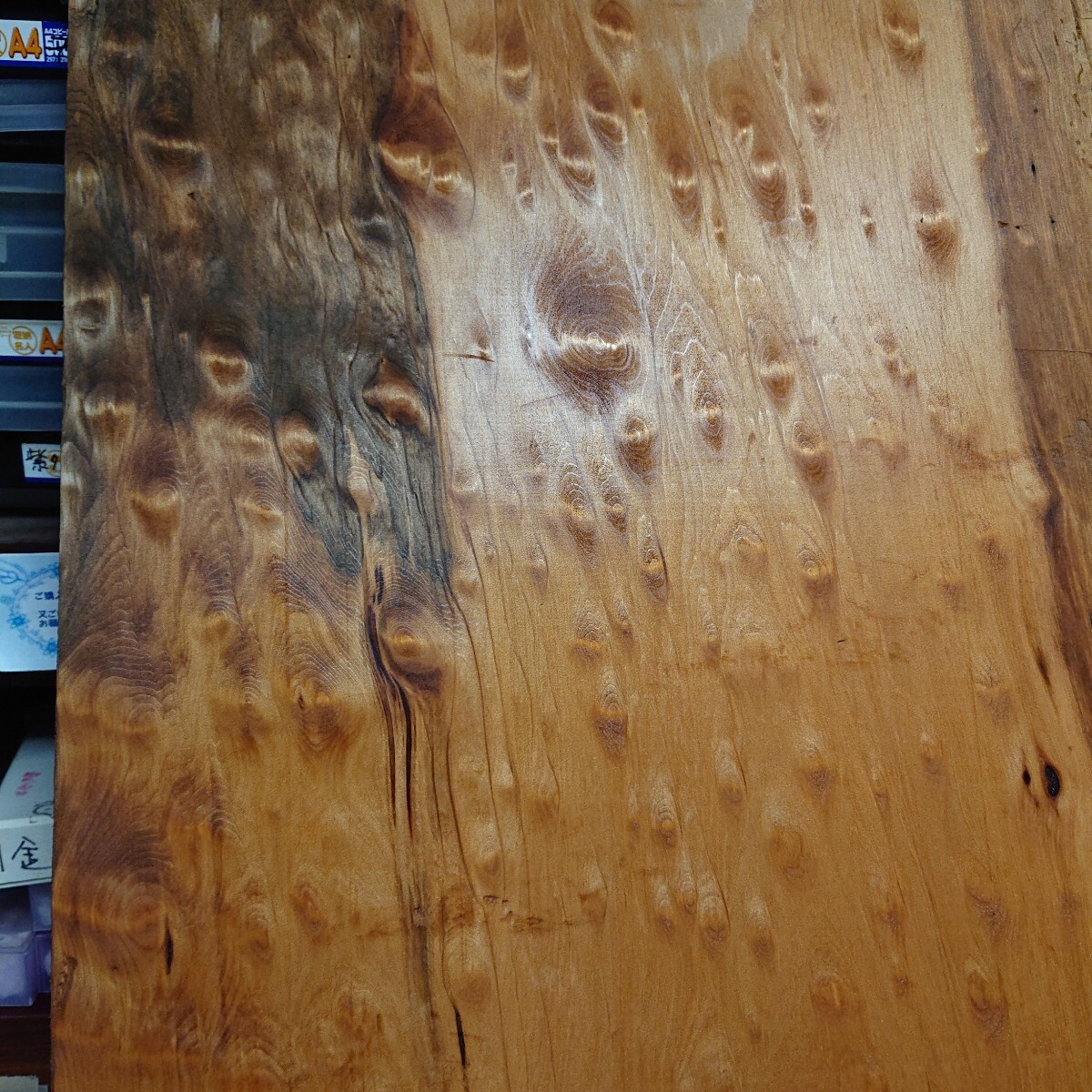 希少銘木桂超々極美杢超々極玉縮み杢の片耳付き幅広極厚ブロック特大です。約長さ974mm 幅395~445mm 厚さ39mm 6796 gです。杢を見やすくするために水引きをして撮影しています。全面たいへん美しい杢と玉縮み杢が浮かび上がっています。めったに出て来ない乾燥良材です。