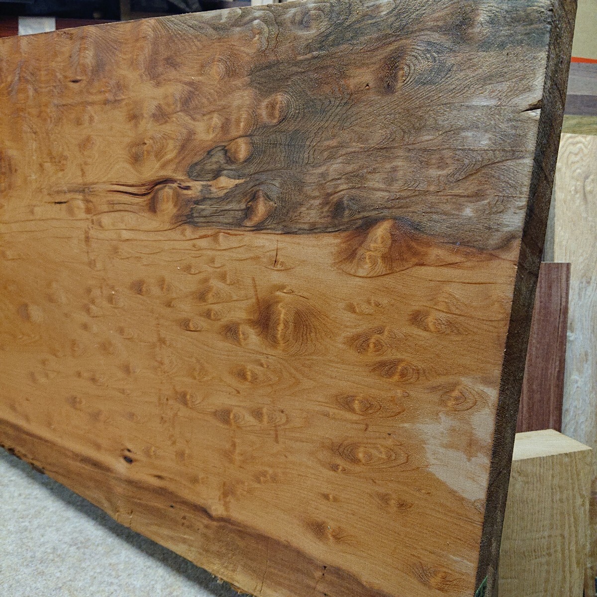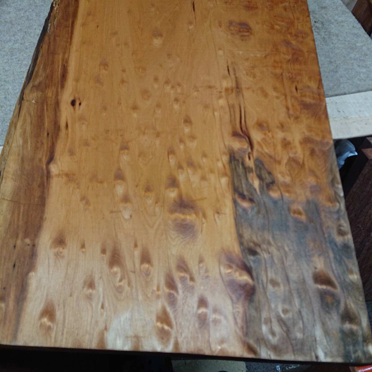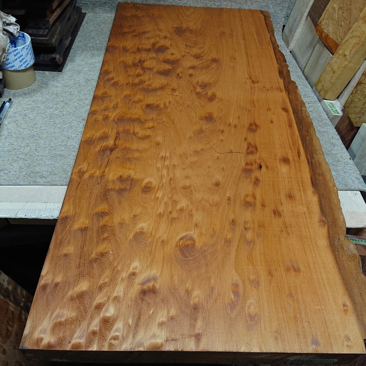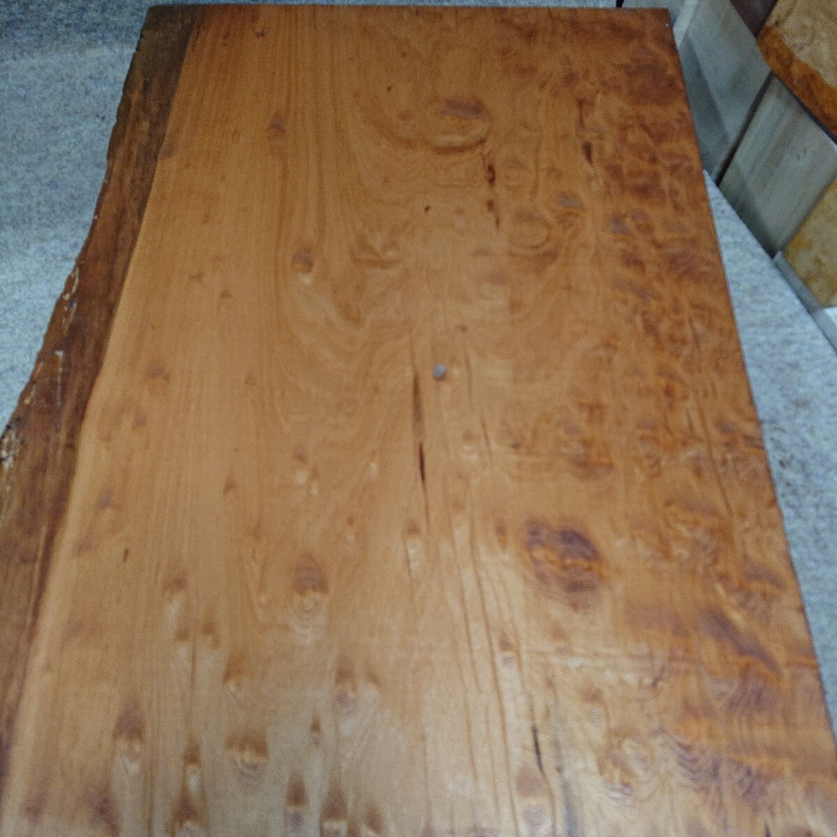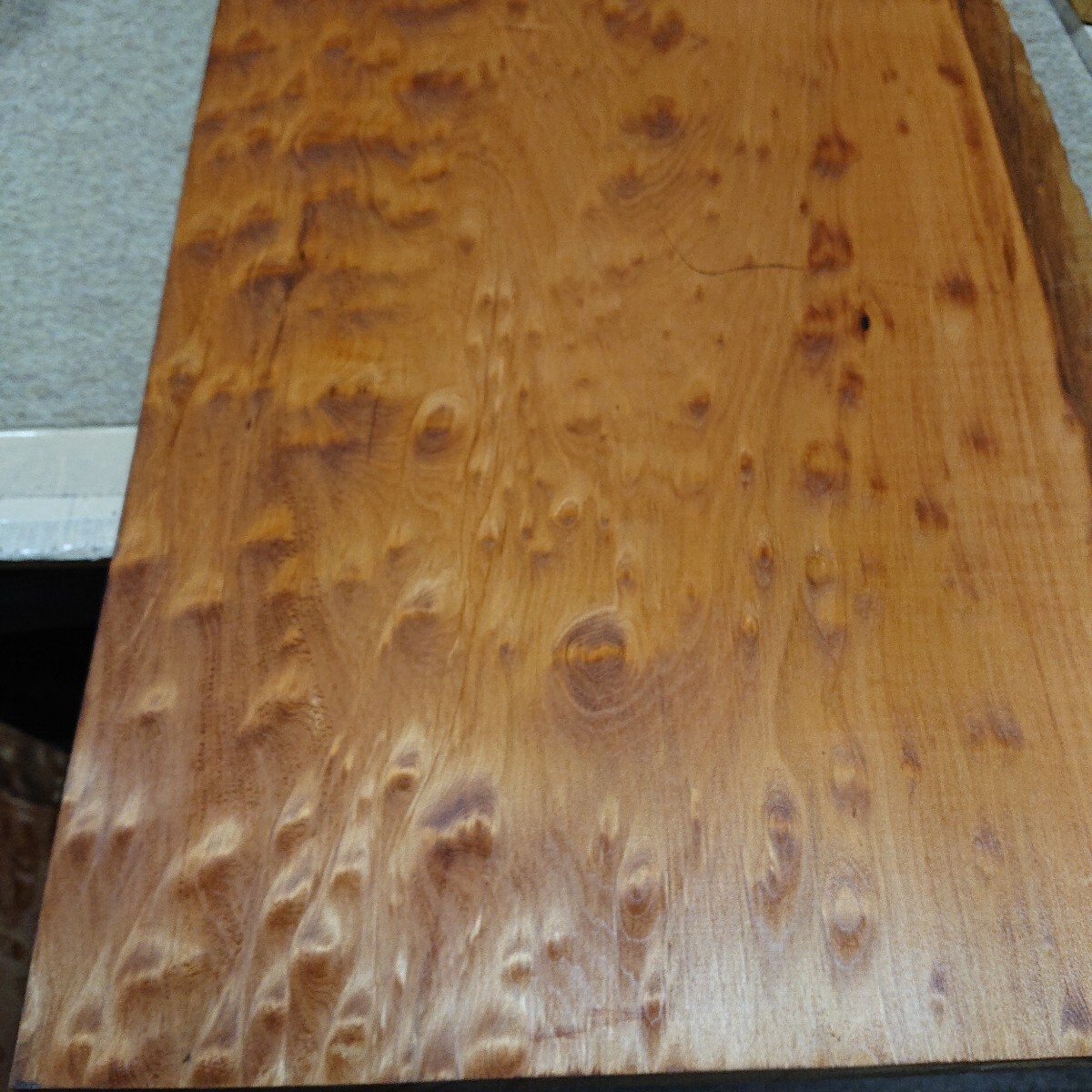 希少銘木桂超々極美杢超々極玉縮み杢の片耳付き幅広極厚ブロック特大です。約長さ974mm 幅395~445mm 厚さ39mm 6796 gです。杢を見やすくするために水引きをして撮影しています。全面たいへん美しい杢と玉縮み杢が浮かび上がっています。めったに出て来ない乾燥良材です。