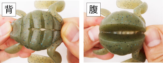 太いボディは曲がりづらいため、フッキング時に針先が出にくい・・・。そこでスクーパーフロッグは背と腹にタテ・ヨコ両方のスリットを入れることで、柔軟性を向上。バイト時にはスムーズにフックが露出することで、抜群のフッキング性能を発揮します。また、マグナムには針先を埋められるリブを設置。スナッグレス性能を優先したい場合に針先を埋められますが、伸びるエラストマー素材ゆえ、薄く刺し入れることを推奨します。