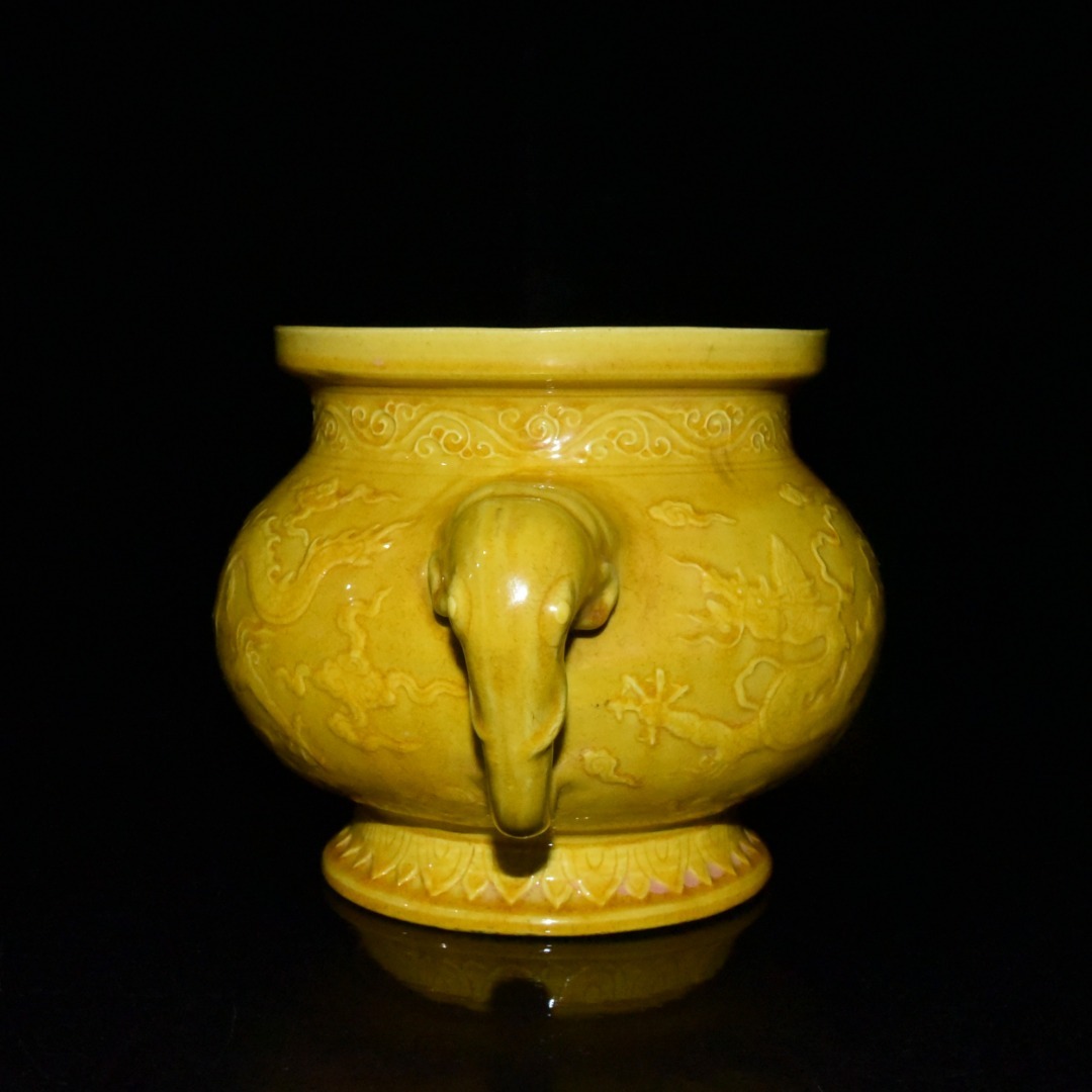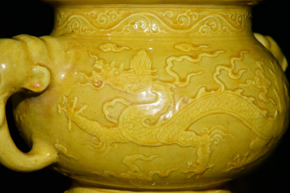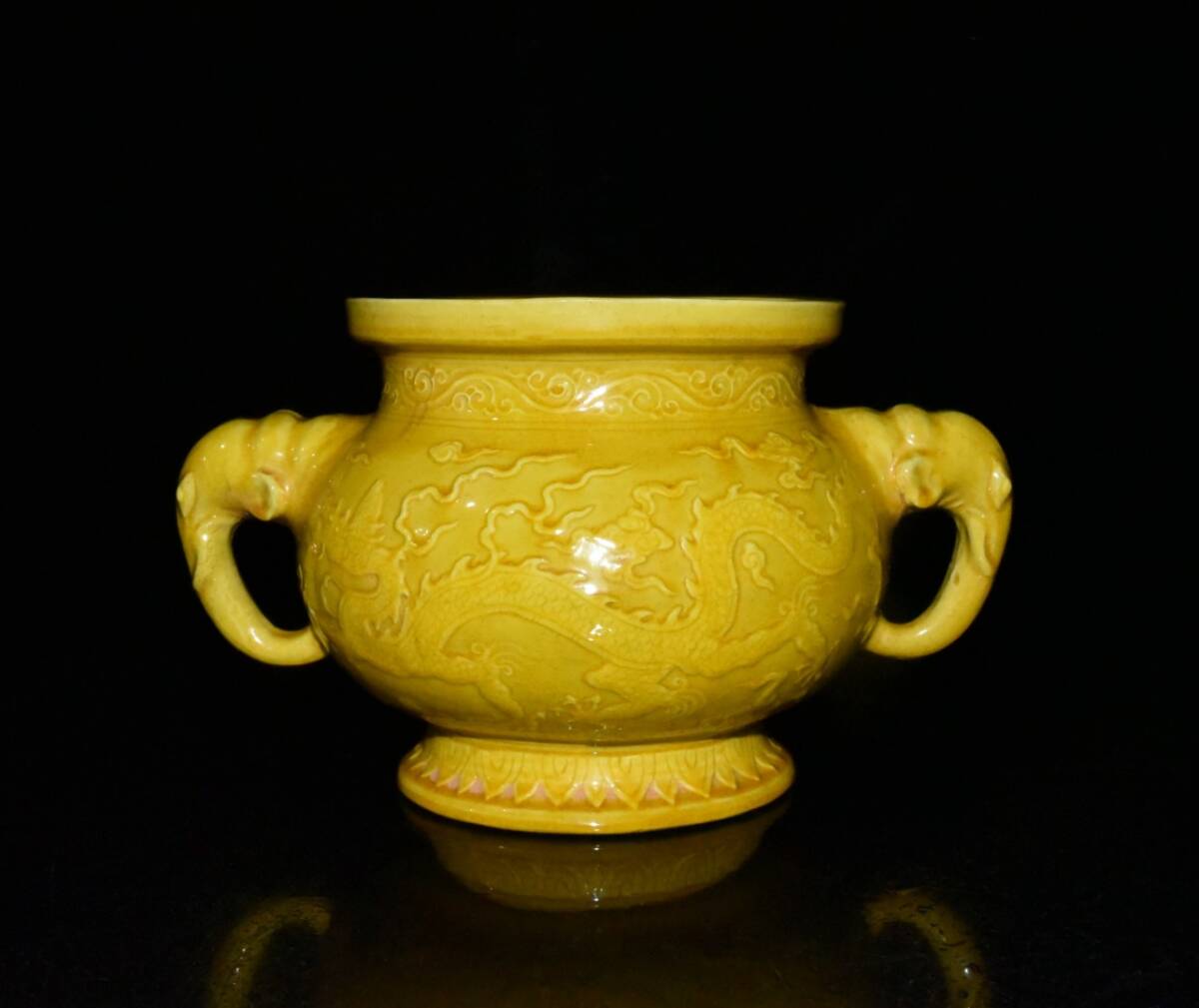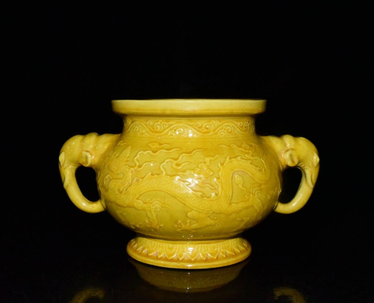 | 【蔵友館蔵品・明・永樂年製款・古陶瓷品・黄釉・浮彫・雲龍紋・象耳香爐・陶藝】・古董品・中国古玩・時代物・希少珍品・中国時代美術100422 |