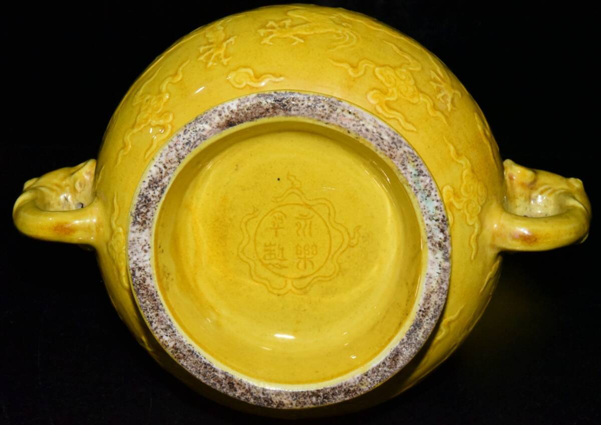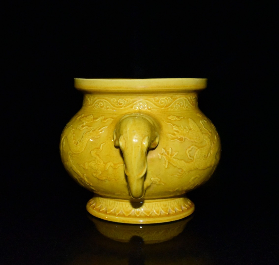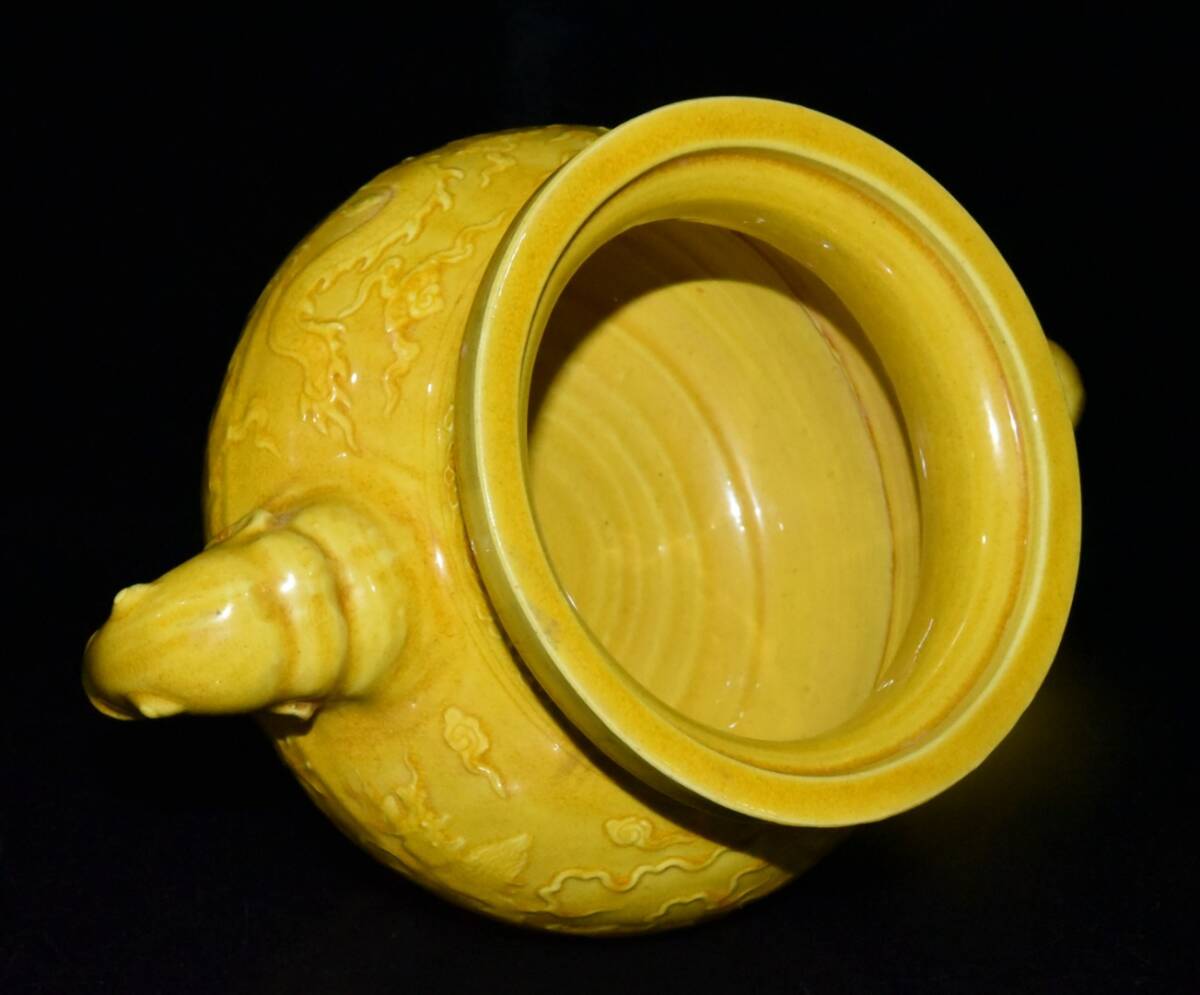 | 【蔵友館蔵品・明・永樂年製款・古陶瓷品・黄釉・浮彫・雲龍紋・象耳香爐・陶藝】・古董品・中国古玩・時代物・希少珍品・中国時代美術100422 |