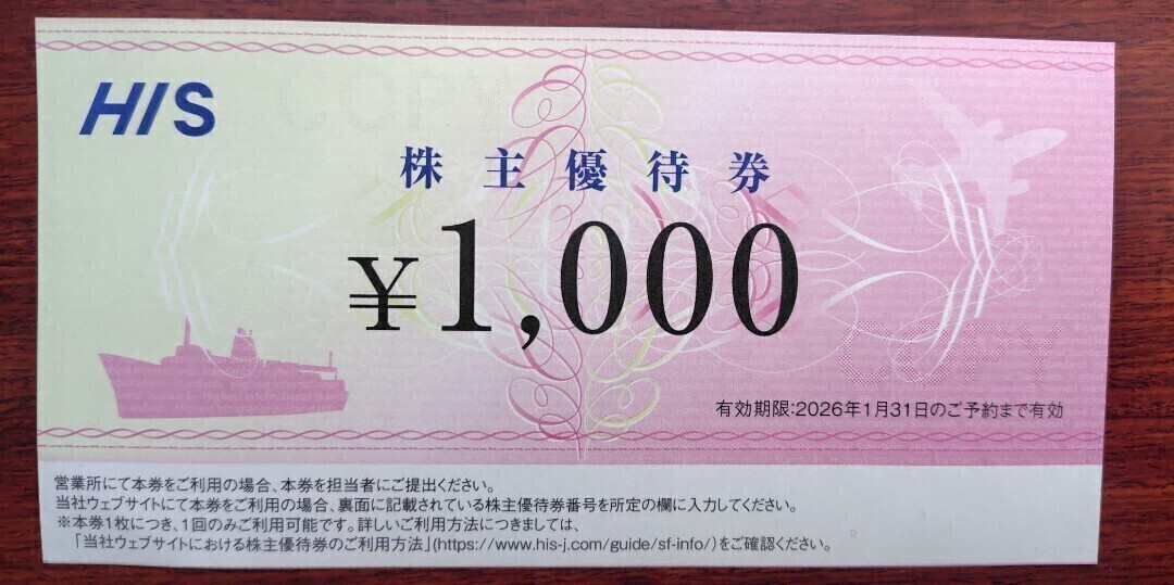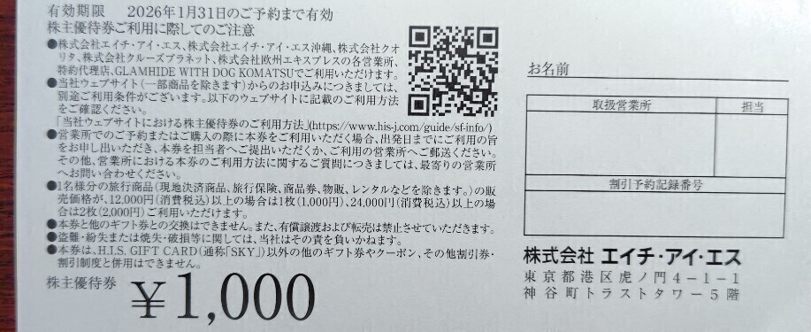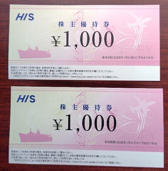 株式会社エイチ・アイ・エスの株主優待券2000円分(1000円2枚)です。