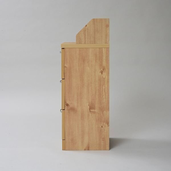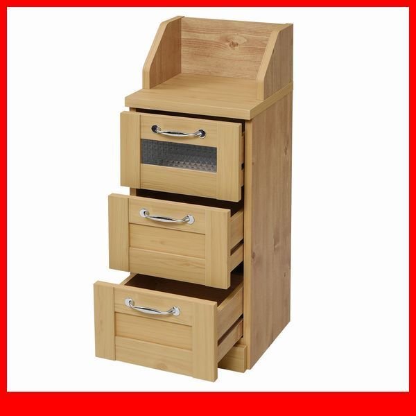 カウンター下のスペースを活用する、カウンター下収納。 カントリーな雰囲気を醸し出す、木目調のデザインが美しいチェストです。 引き出しが3杯ついているので、 取り出しやすいところに置いておきたい日用品を収納するのにとても便利です。 |