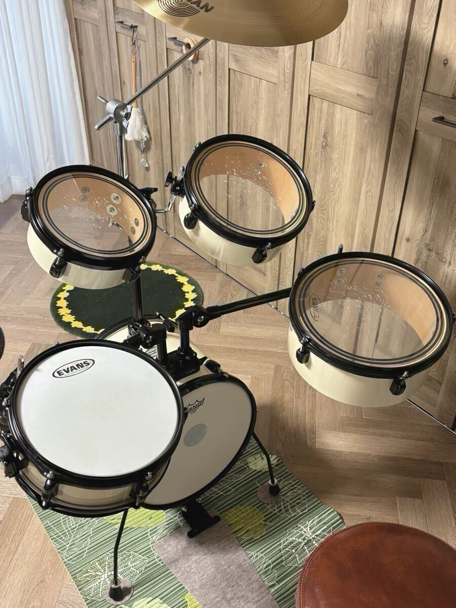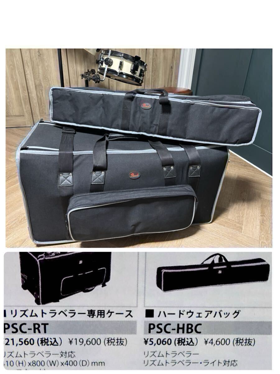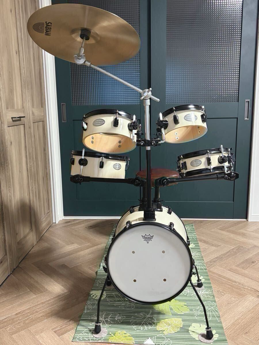 小規模LIVEで5〜6回使用しただけのリズムトラベラーVersion2です。シェルセットなのでハイハットとハイハットスタンドはありませんが、18インチのSABIANクラッシュライド(ヒビ、割れ、歪み無し)とシンバルホルダーが付いています。加えて専用の本体ケースとハイハットスタンドを入れるハードウェアケースもセットです。(ケースは損傷個所無し)