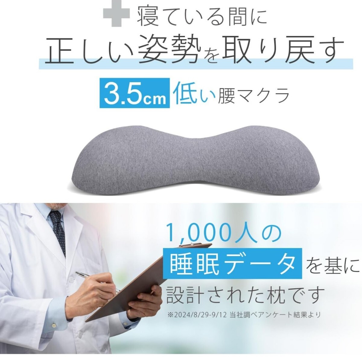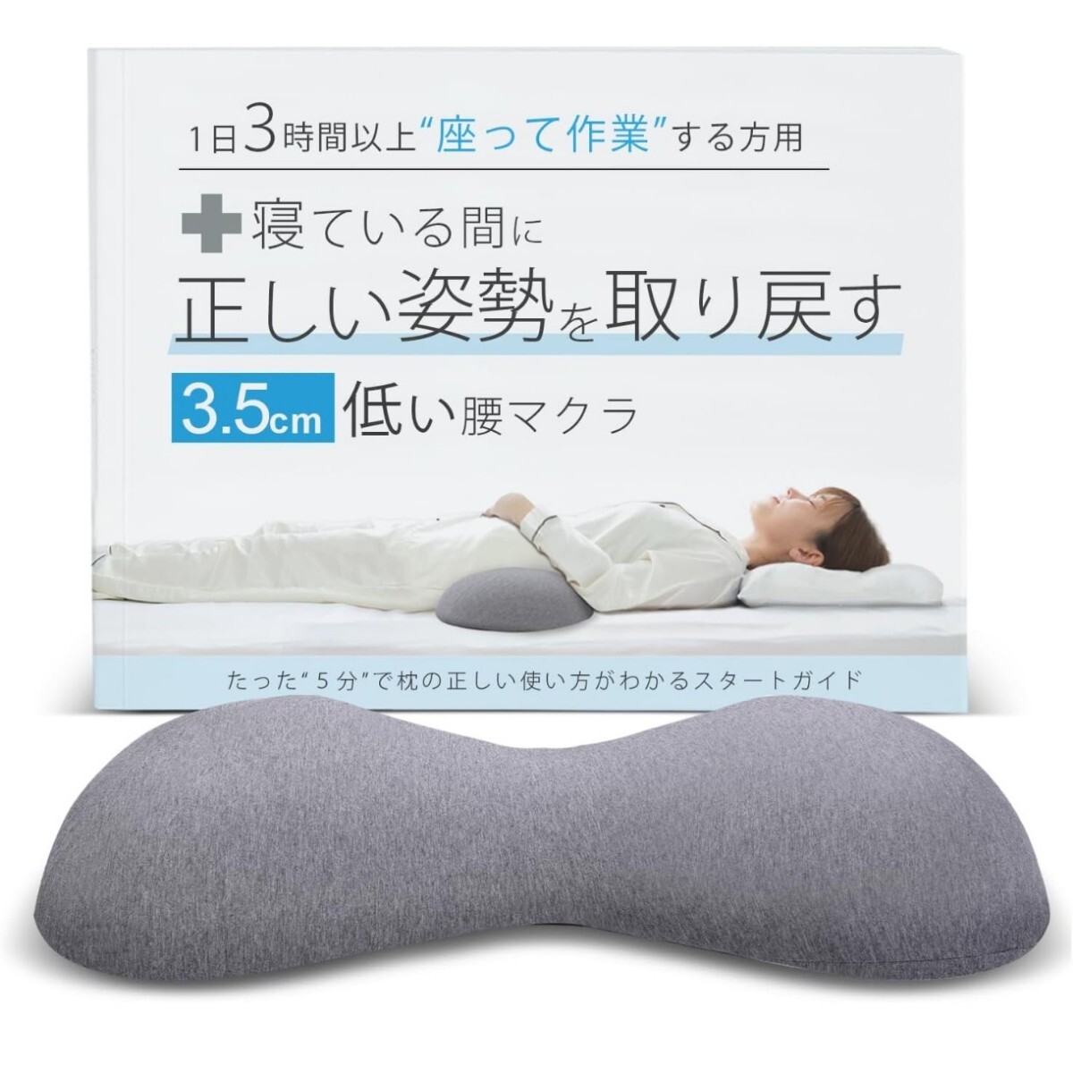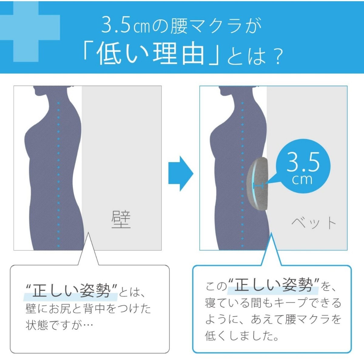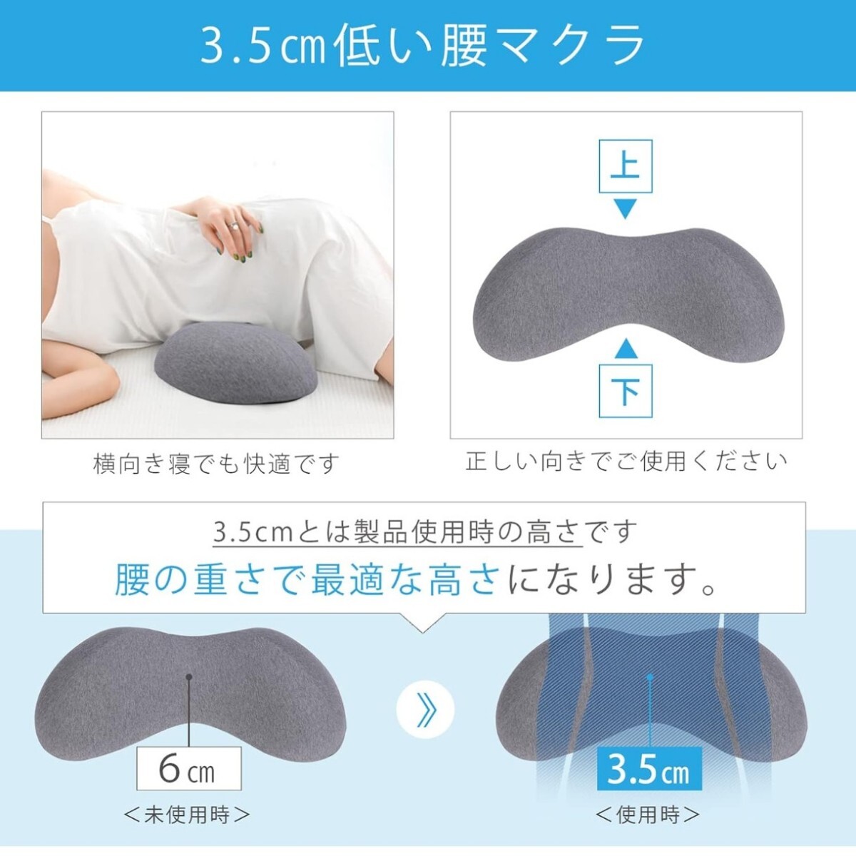 3.5cmの低い腰枕で、正しい姿勢を保ったま眠れる商品です。