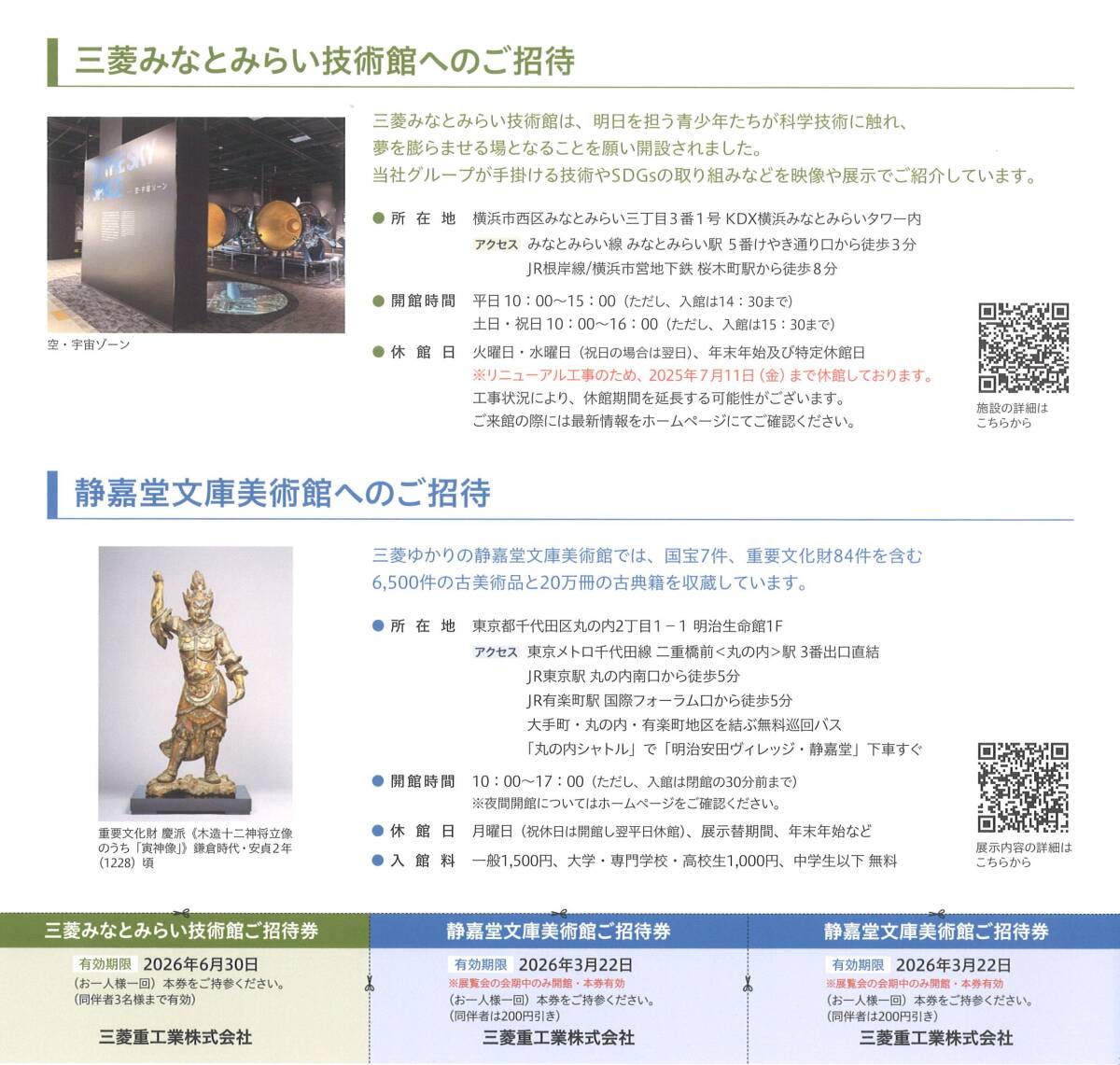 有効期限 三菱みなとみらい技術館ご招待券「2026年6月30日」 静嘉堂文庫美術館ご招待券「2026年3月22日」 1枚につき、お1人様1回ご利用いただけます。 ※詳細につきましては、画像やホームページ等をご覧ください。 |