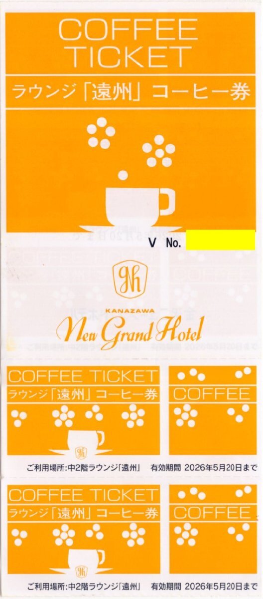 *.[10枚綴り] 金沢ニューグランドホテル プレステージ ラウンジ「遠州」コーヒー(紅茶)無料券 1冊 2026/5/20期限