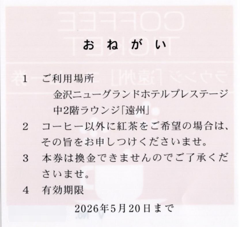 本券は金沢ニューグランドホテルプレステージ中2階ラウンジ「遠州」でご利用頂けるコーヒーチケットです。