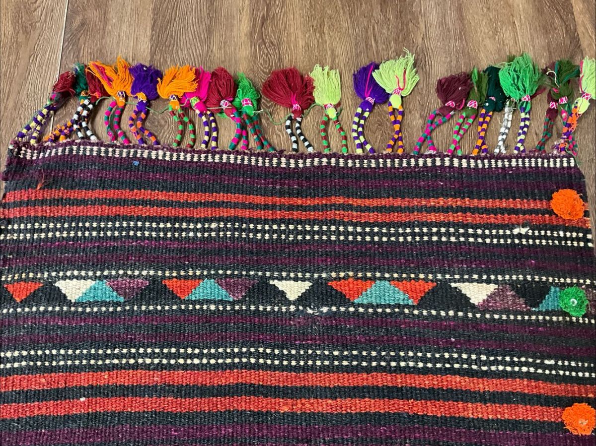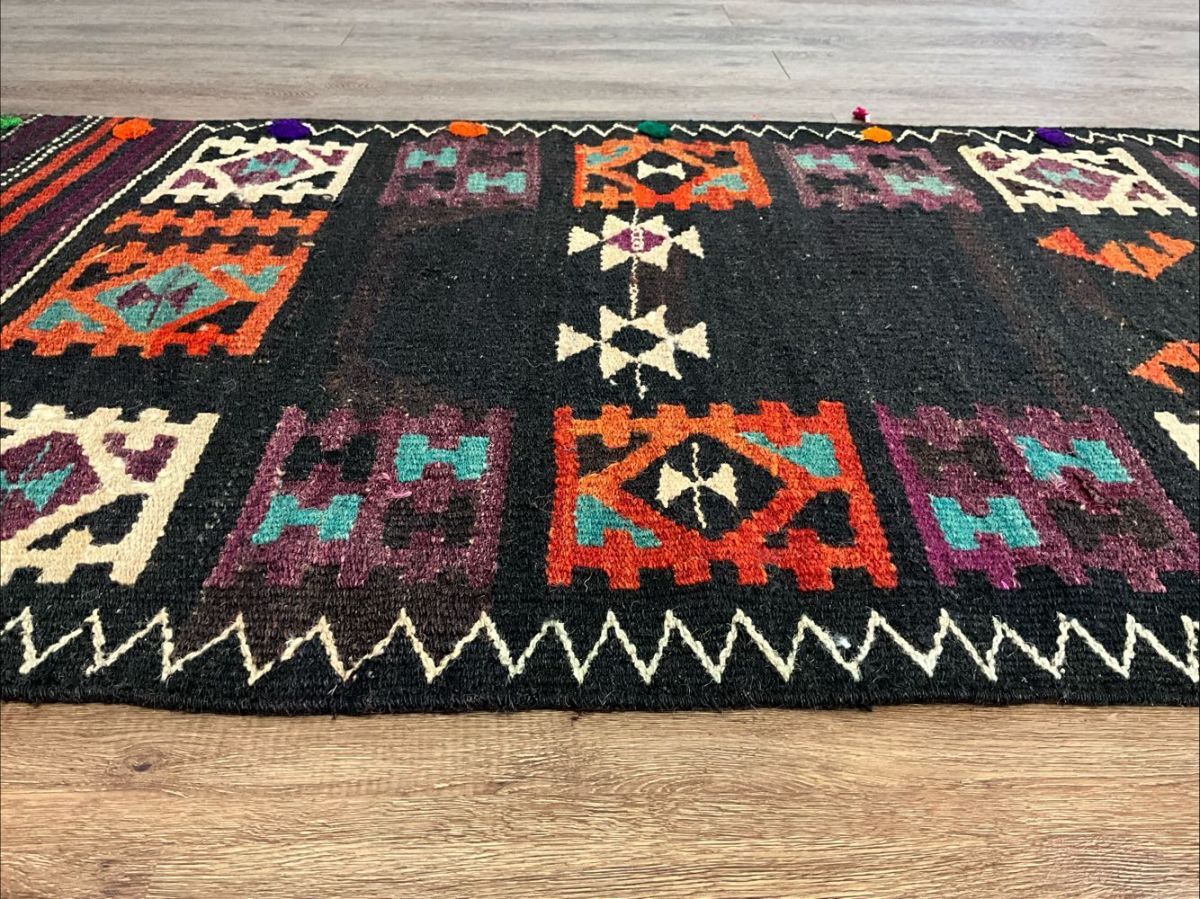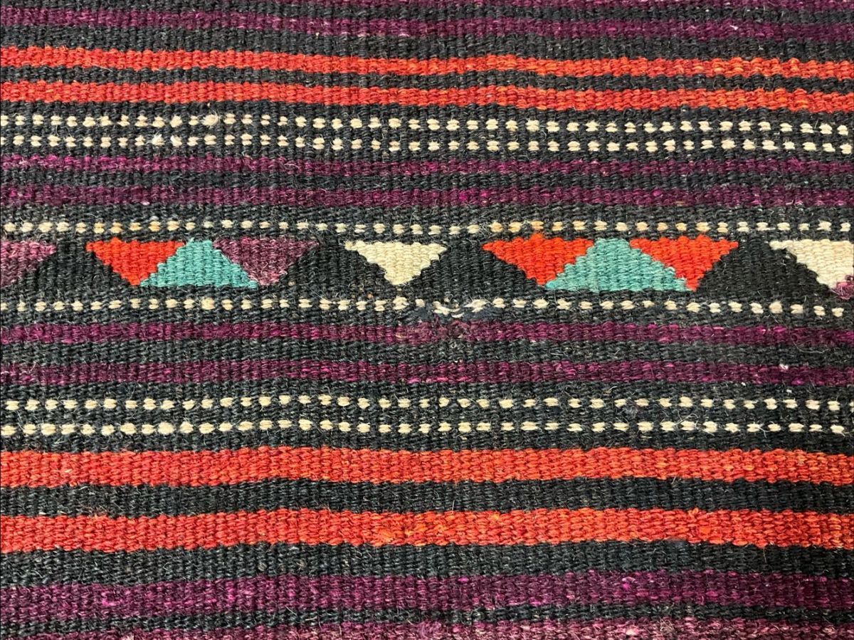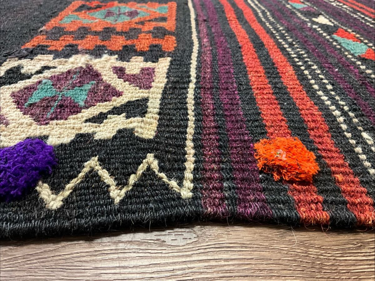 ★大型キリム★経年による擦れ、上部中央にリペア痕がございます。目の詰まった丈夫な織り、カラフルなフリンジや後付けの房飾りで装飾されたデザイン、通気性良くモチーフの輪郭を強調するスリット織りなど、職人の手仕事を感じるオススメの一枚です。遊牧民の生活文化に欠かせないキリム。平織りのキリムは肌離れが良く、屋内だけでなくアウトドアでご使用いただいても雰囲気抜群です。(画像をご確認下さい。) (ハンドメイド特有の歪みがございます。)