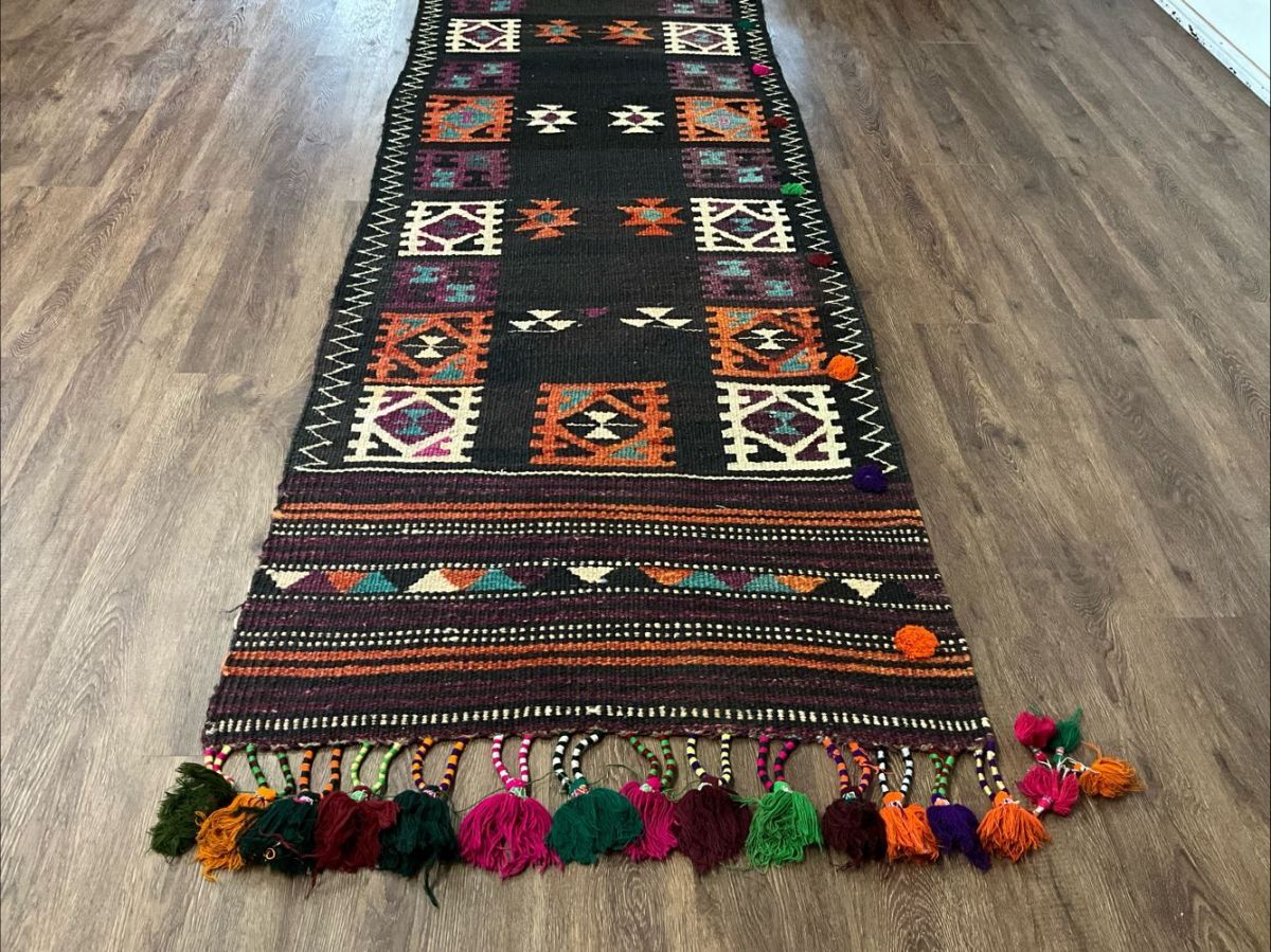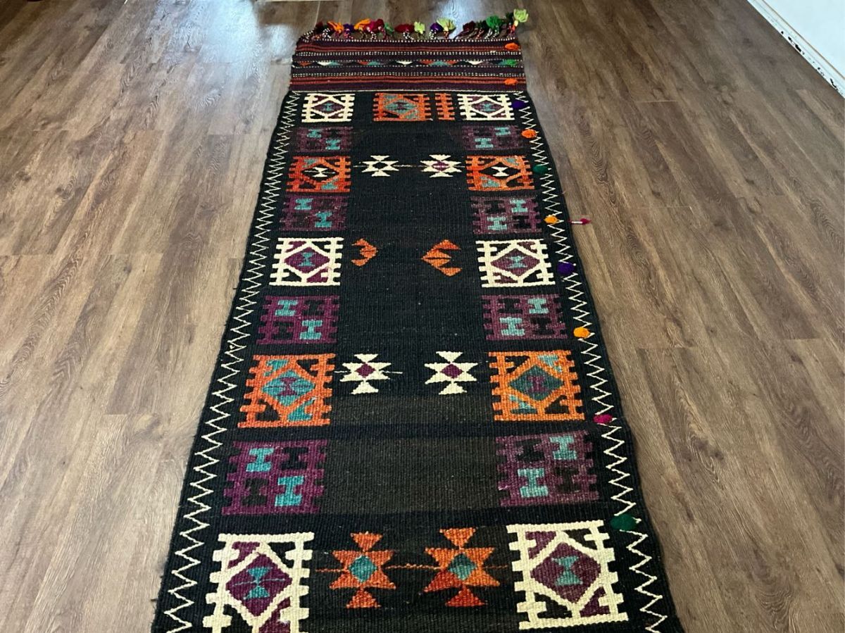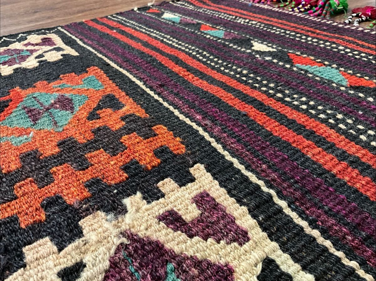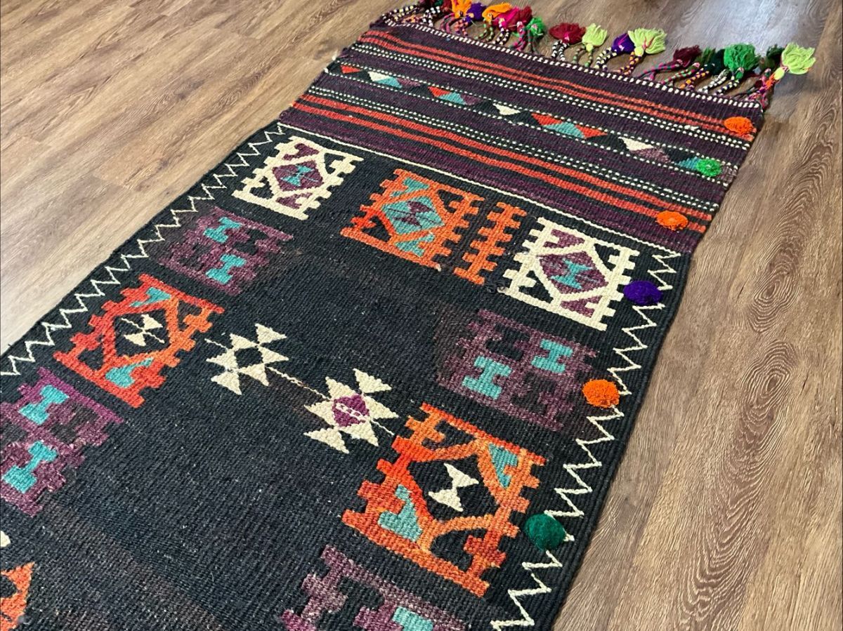 ★大型キリム★経年による擦れ、上部中央にリペア痕がございます。目の詰まった丈夫な織り、カラフルなフリンジや後付けの房飾りで装飾されたデザイン、通気性良くモチーフの輪郭を強調するスリット織りなど、職人の手仕事を感じるオススメの一枚です。遊牧民の生活文化に欠かせないキリム。平織りのキリムは肌離れが良く、屋内だけでなくアウトドアでご使用いただいても雰囲気抜群です。(画像をご確認下さい。) (ハンドメイド特有の歪みがございます。)