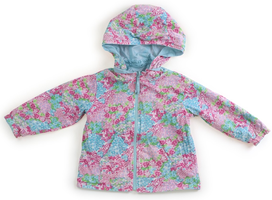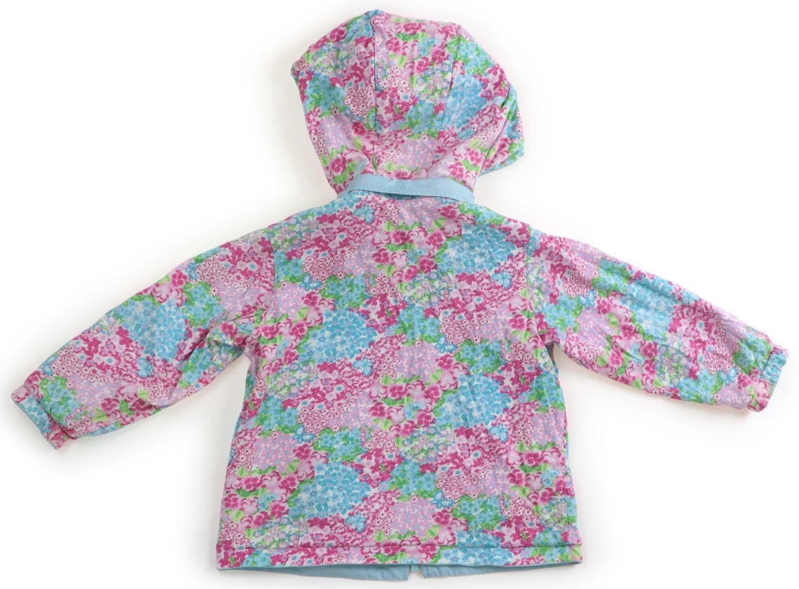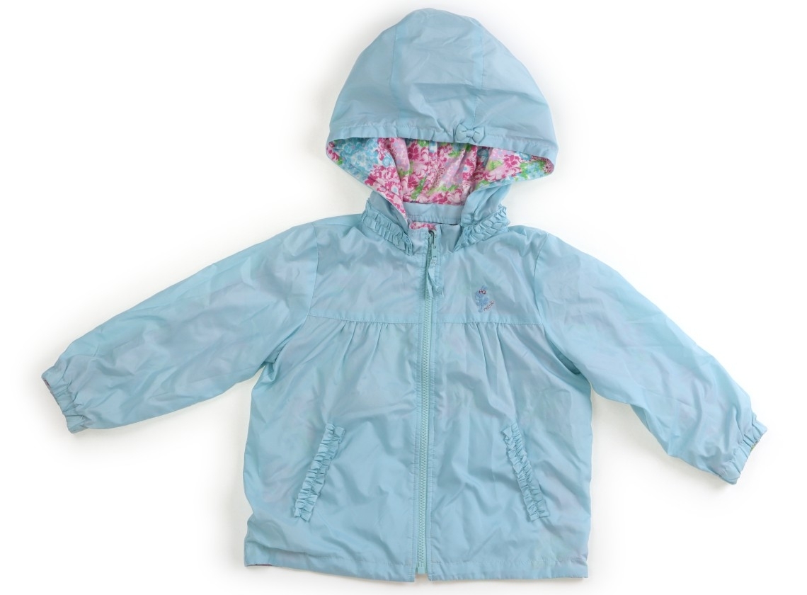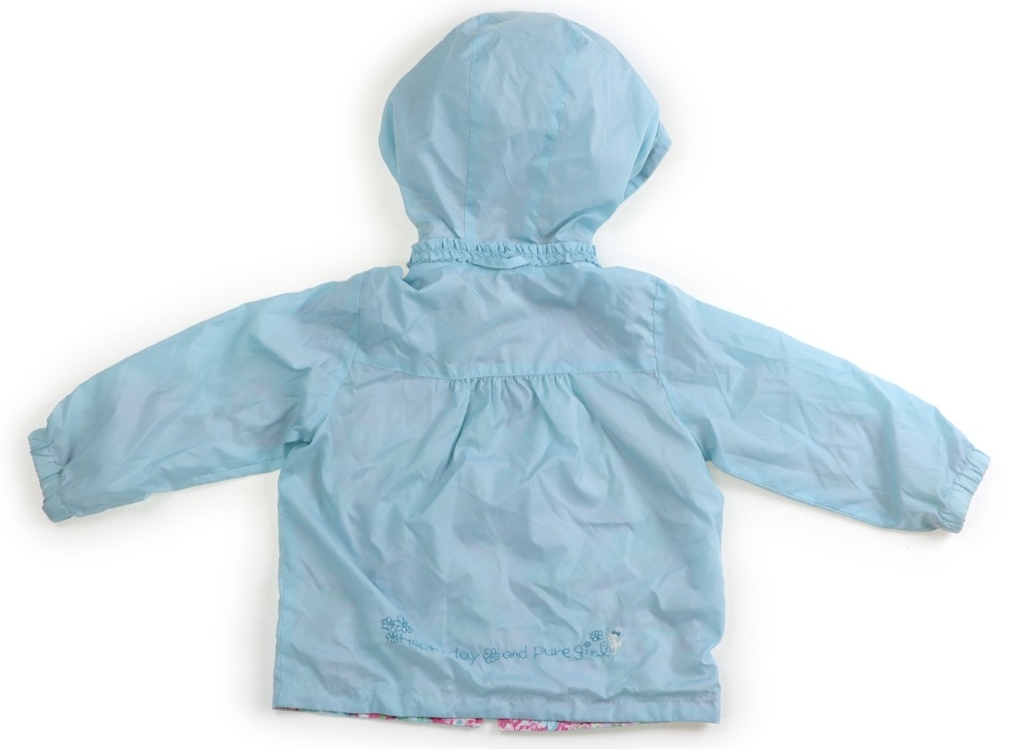 リバーシブルで着られます。無地側はポリエステル製、柄側はカットソー生地です。フードの取り外しが可能です。袖口にスレ感やポケットのフリルに毛玉、お腹に薄い汚れが見受けられます。