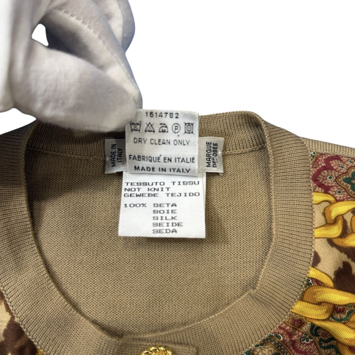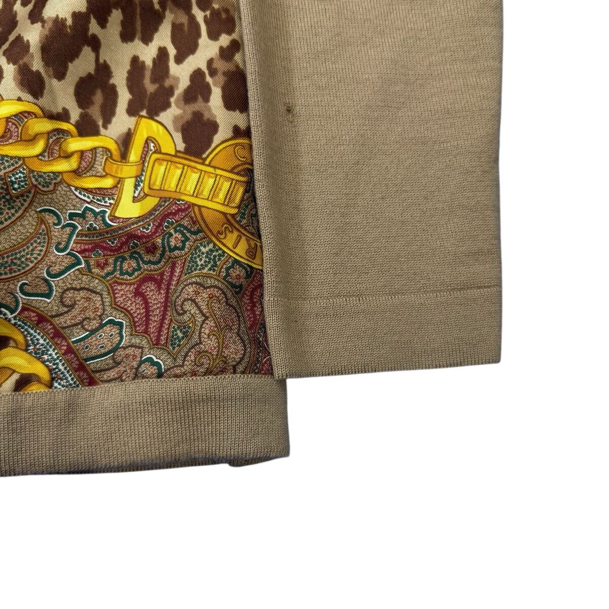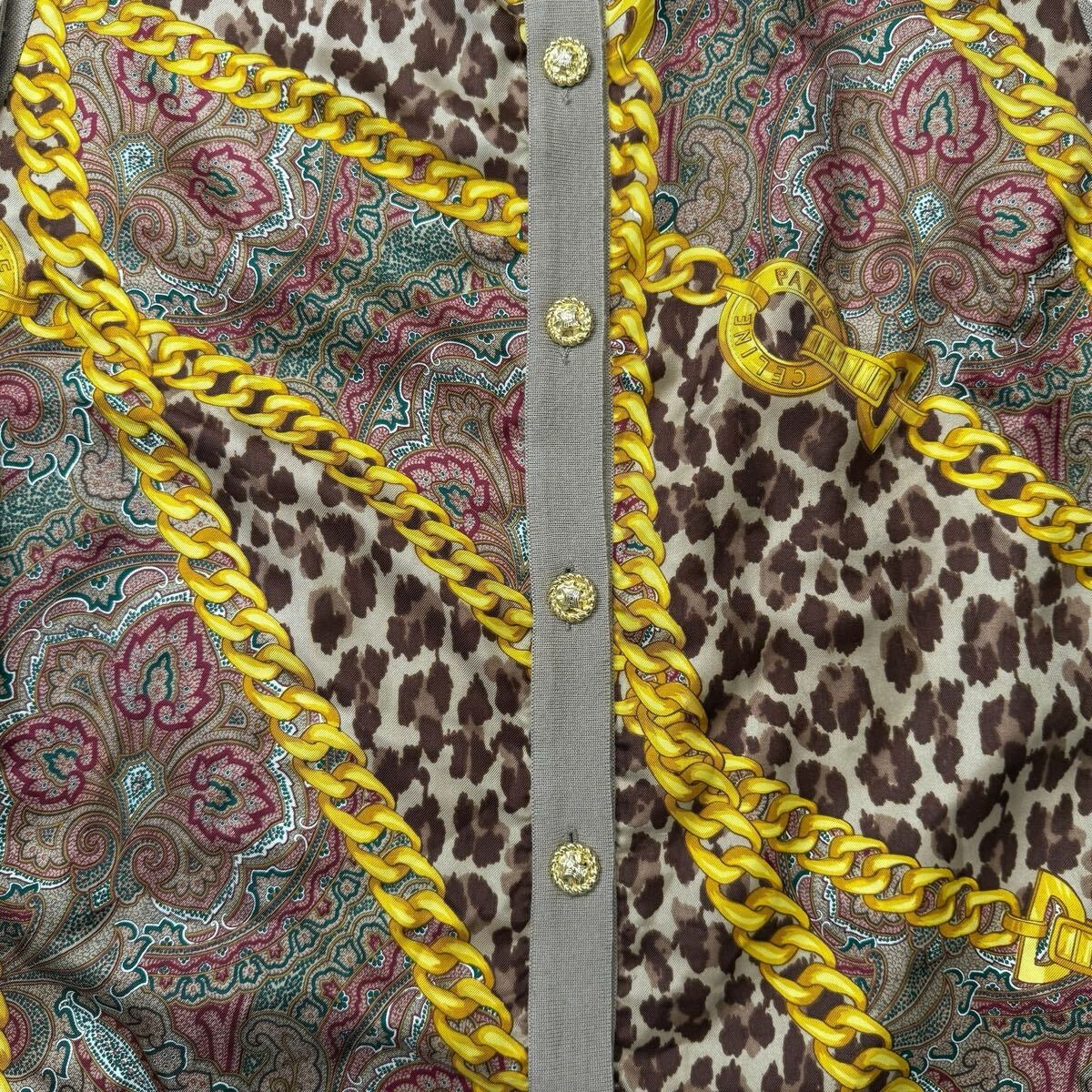 このカーディガンは、セリーヌのハウスコードであったクラシックなチェーンモチーフに、挑発的なレオパード柄とエキゾチックなペイズリー柄を組み合わせることで、まさに「芸術を着る」という体験を提供します。異なるパターンと質感が見事に調和し、一枚のキャンバスの上で複数の物語が語られているかのようです。ゴールドのボタンがさらにリュクスな輝きを添え、細部にまでこだわり抜かれた職人技が光ります。