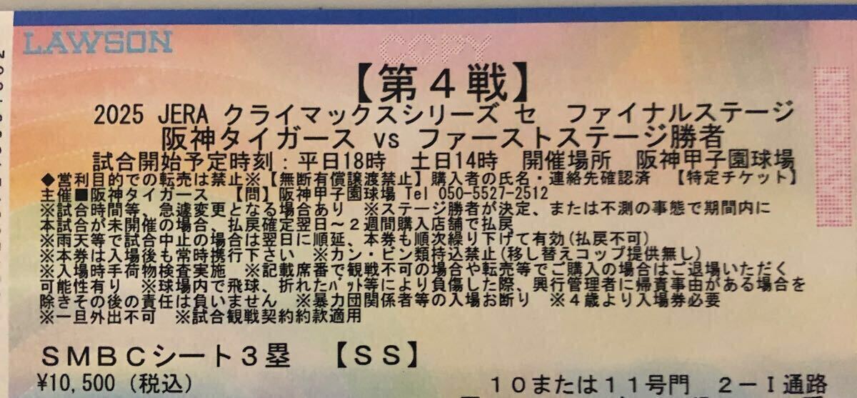 タイガースが3連勝して日本シリーズ進出が決定すると第4戦の試合開催がありませんので、その場合はチケットを返送して頂いた上で、ご指定の口座に落札額から販売手数料と振込手数料を差引いた額を返金させて頂きます。