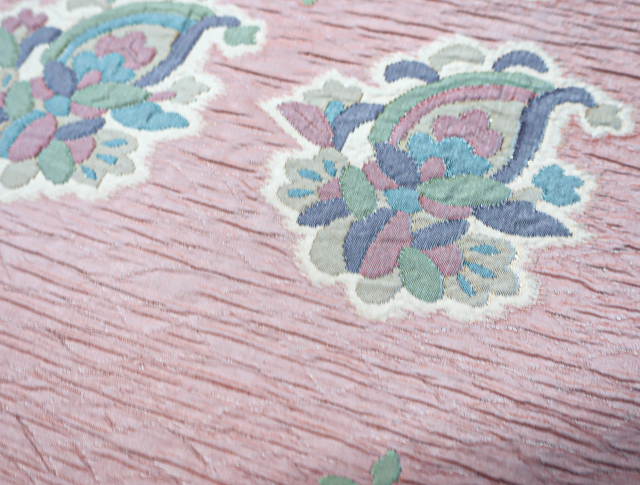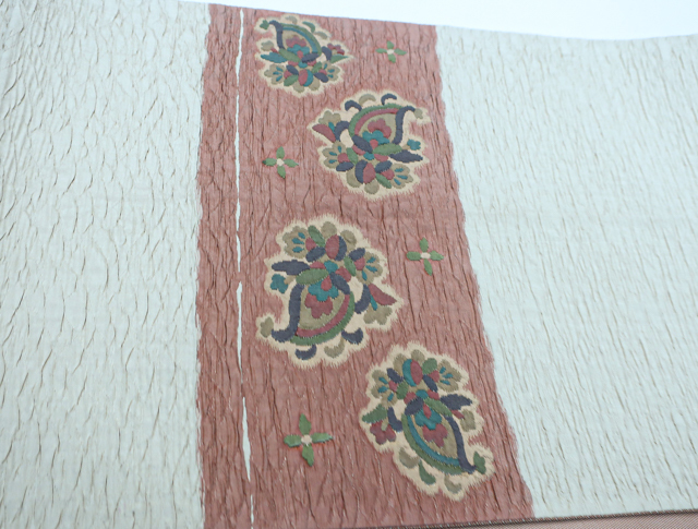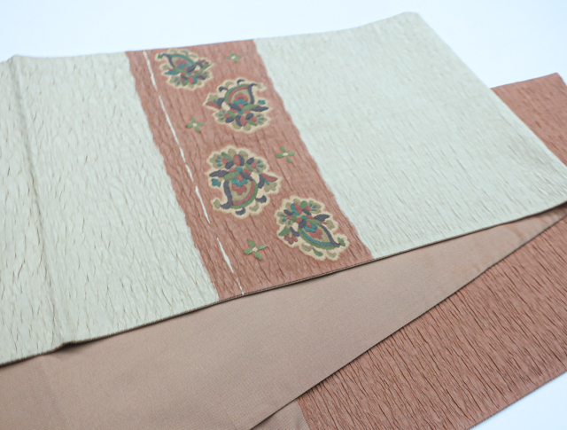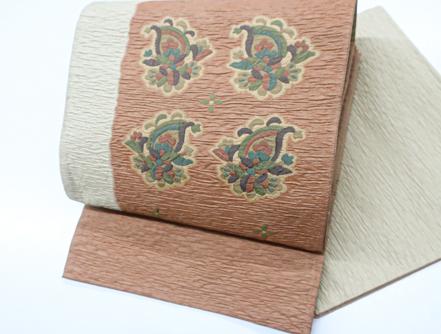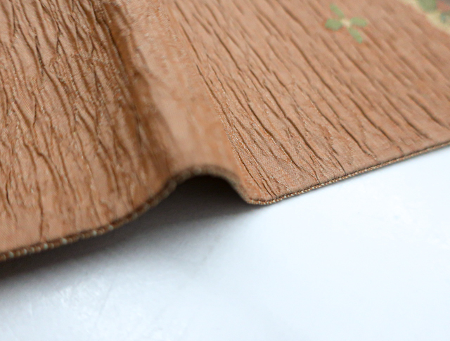リサイクル商品のため、無地場折れ山に薄汚れがございますが、着用可能なお品です。 地色は、赤茶色×ベージュです。 1枚目の画像が近いお色かと思われます。 素材は正絹です。 |